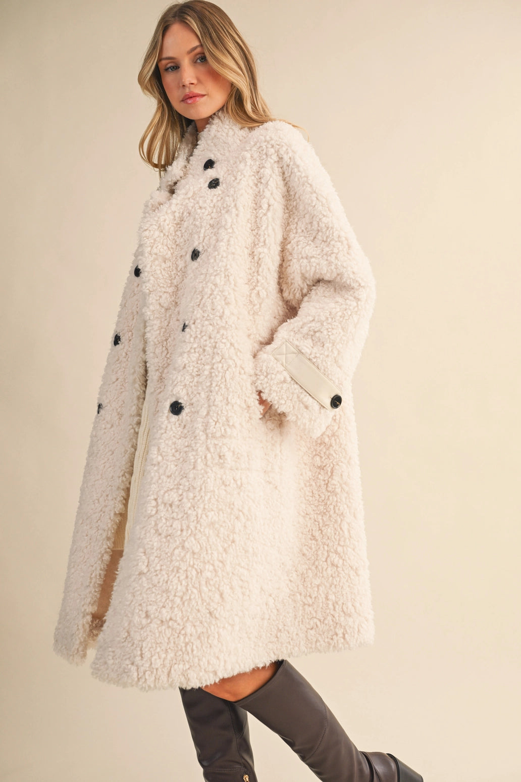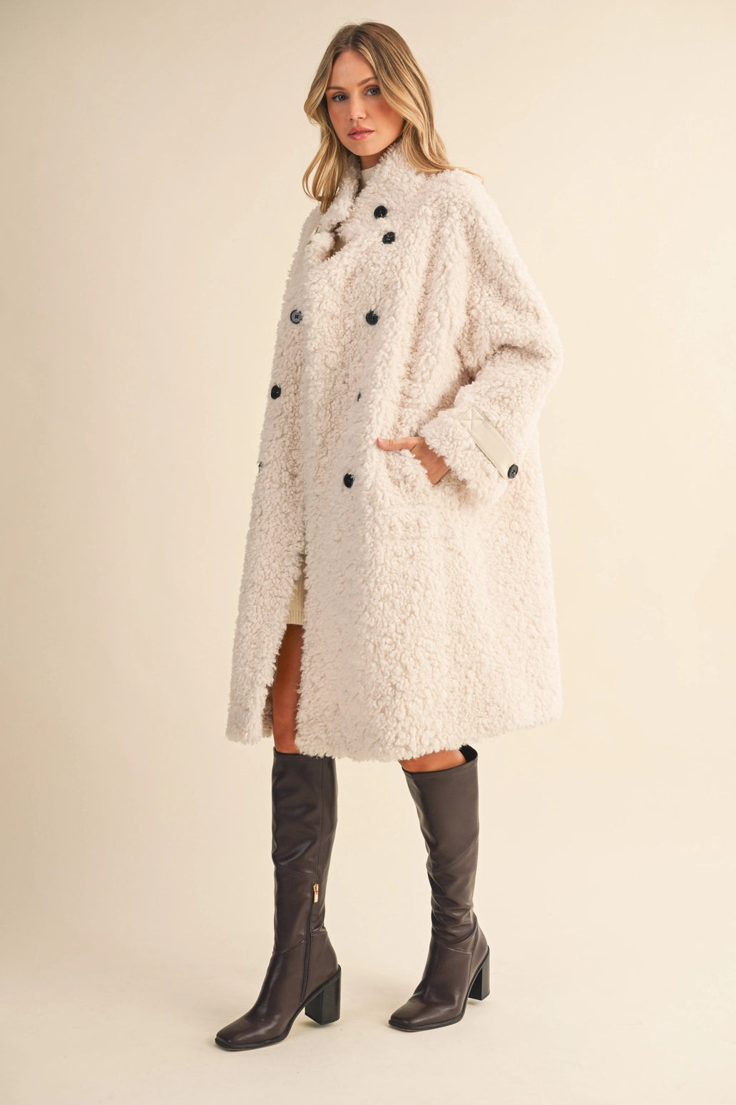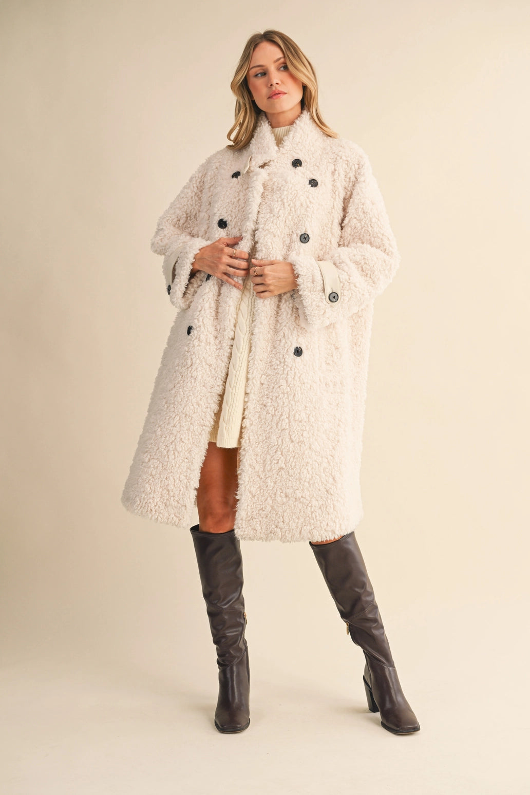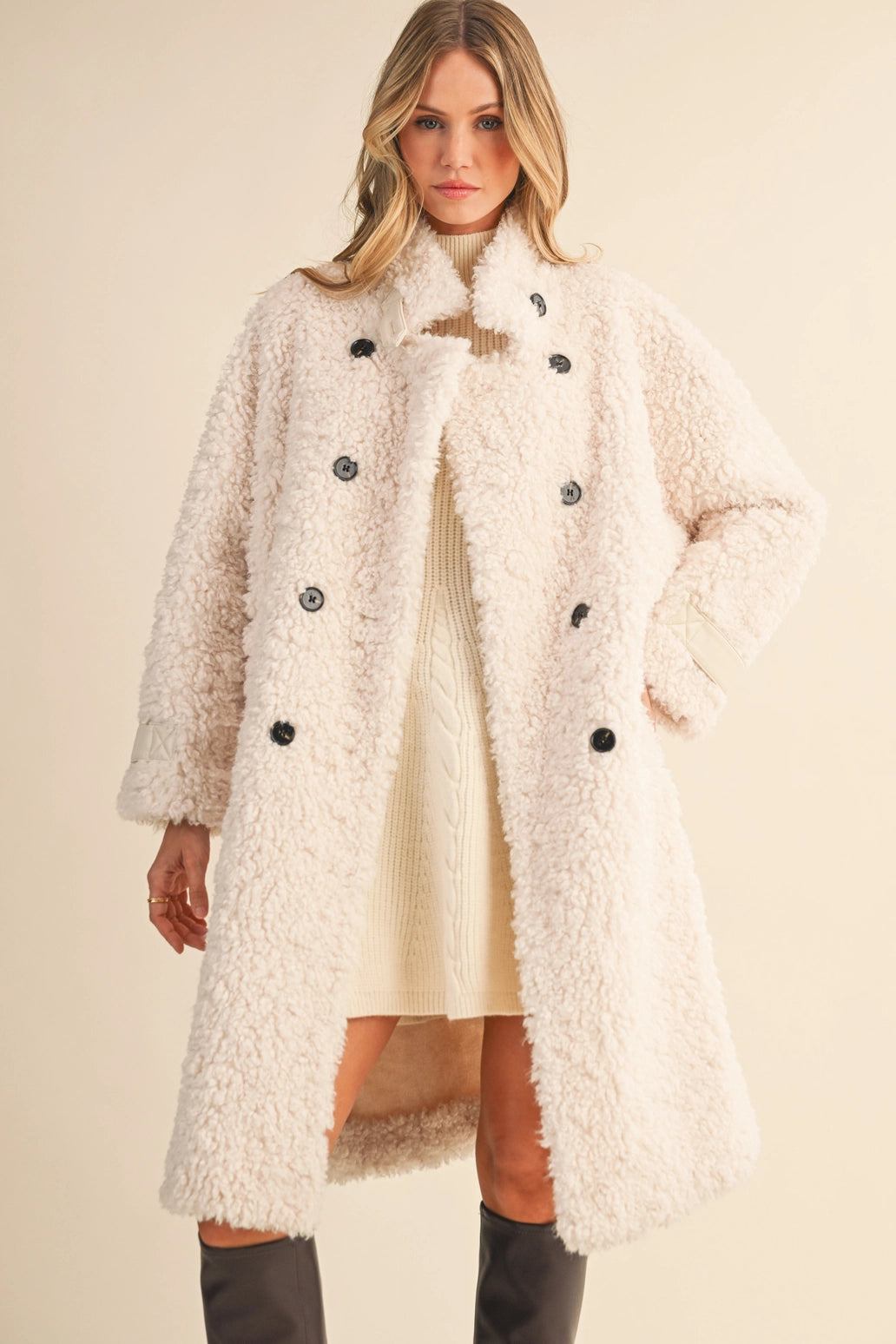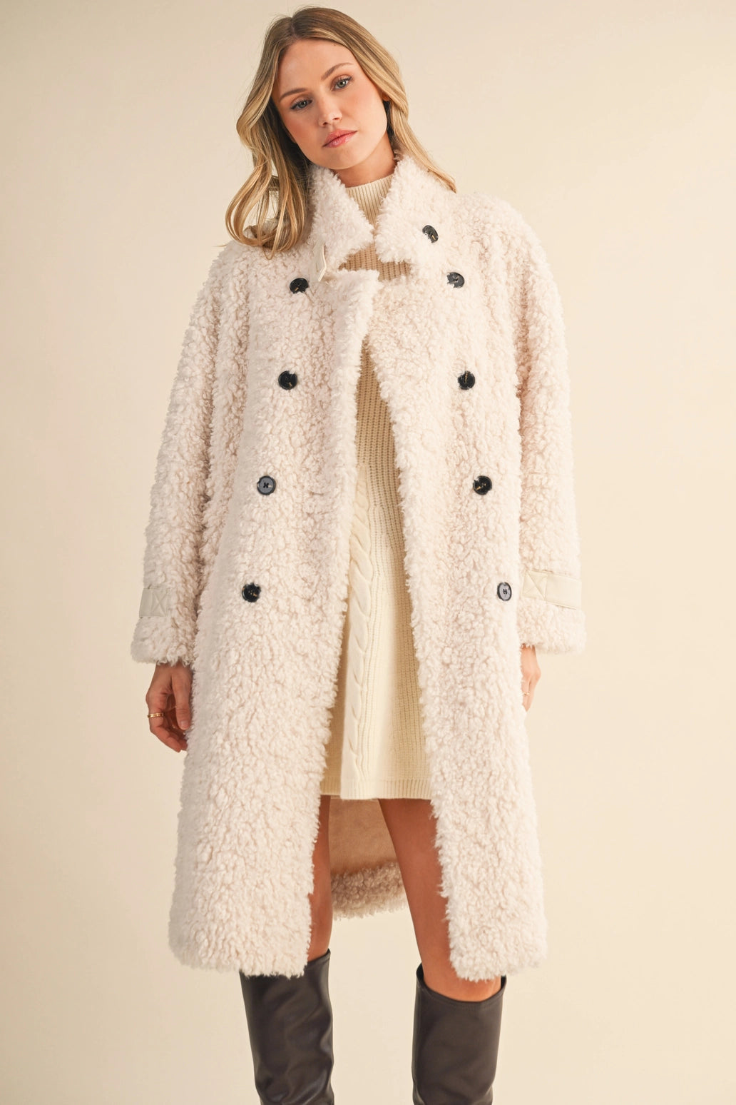 Featuring a chic double-breasted front, bold black buttons, and quilted cuff details, this jacket serves serious "cool girl in the city" energy. Made from a luxe blend of 90% polyester and 10% wool, it’s designed for maximum warmth without compromising style. With deep side pockets and a plush teddy texture, this coat is just as functional as it is fashionable.
