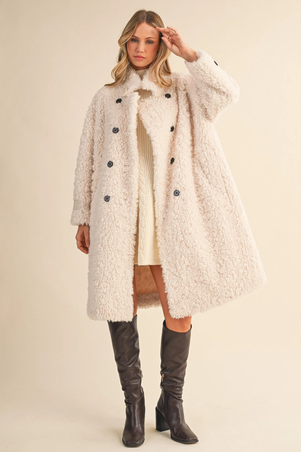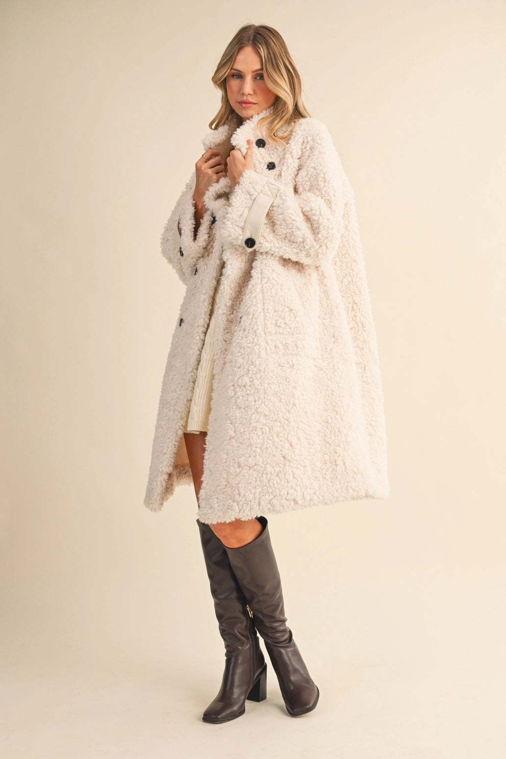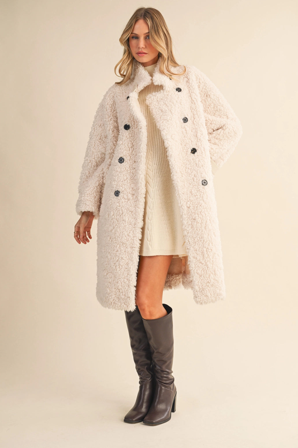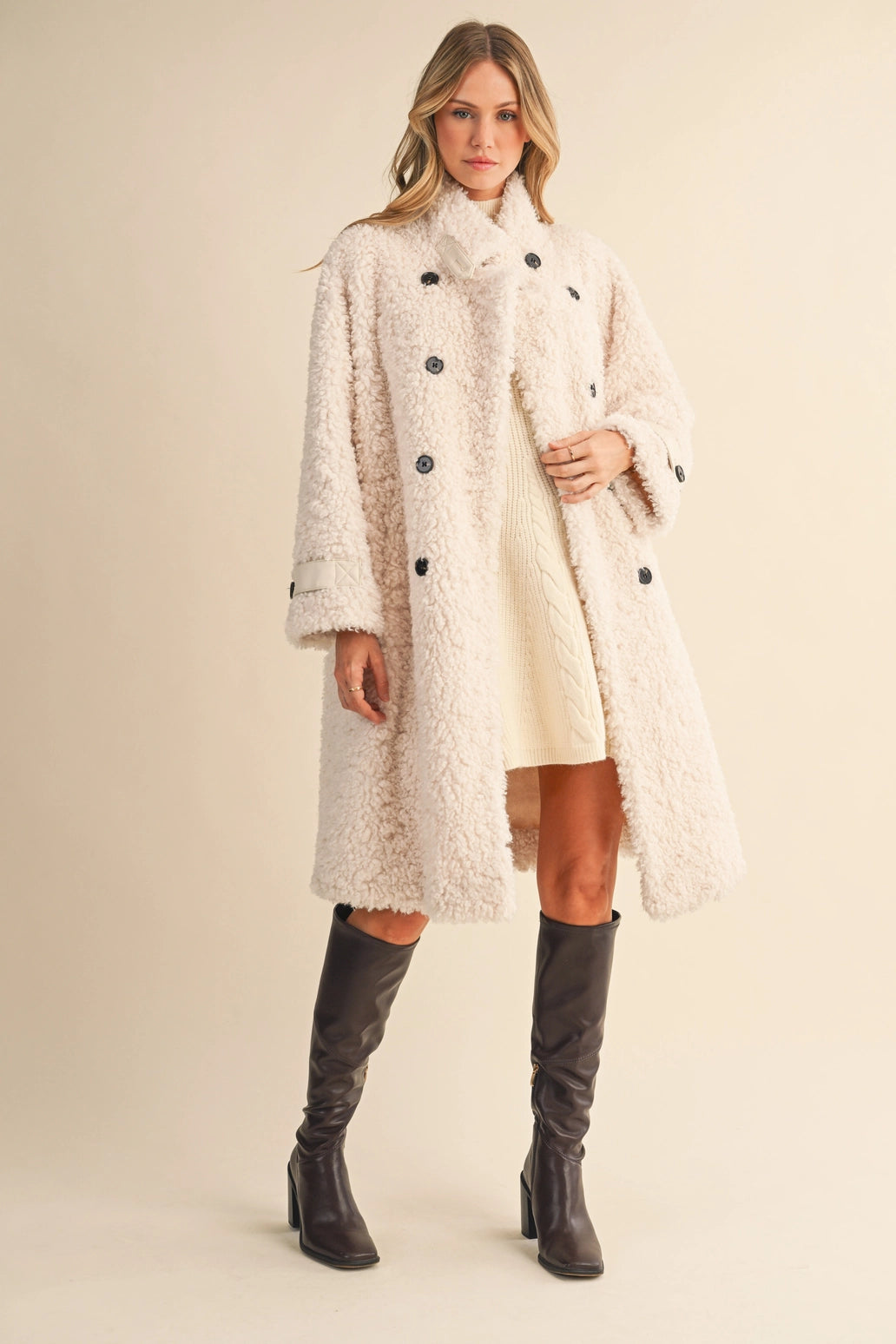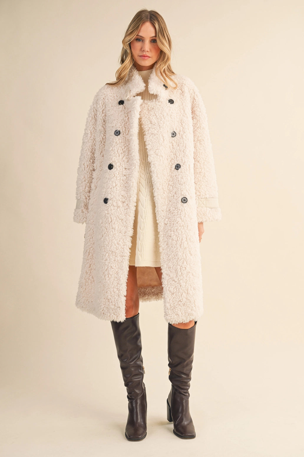 Featuring a chic double-breasted front, bold black buttons, and quilted cuff details, this jacket serves serious "cool girl in the city" energy. Made from a luxe blend of 90% polyester and 10% wool, it’s designed for maximum warmth without compromising style. With deep side pockets and a plush teddy texture, this coat is just as functional as it is fashionable.