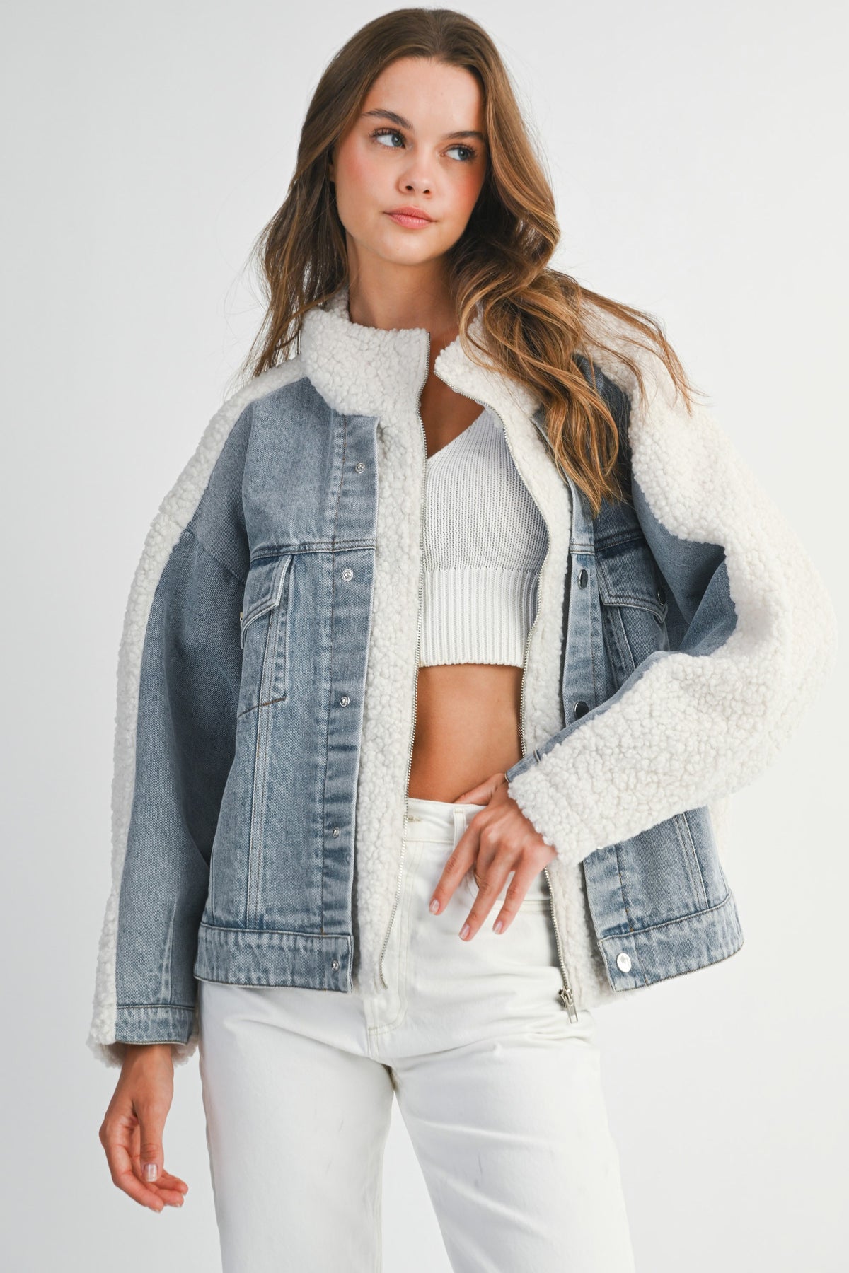 Meet your new cold-weather favorite: the Bree Denim Fleece Jacket. This oversized stunner is the perfect combo of cozy meets street chic. Crafted with a soft sherpa fleece interior and structured denim exterior, it’s designed to turn heads and keep you warm. Featuring a full front zip closure and dual texture detailing, it effortlessly elevates your fall-to-winter wardrobe. Whether you're layering it over a cropped knit or throwing it on for a coffee run, this jacket delivers that off-duty model energy.