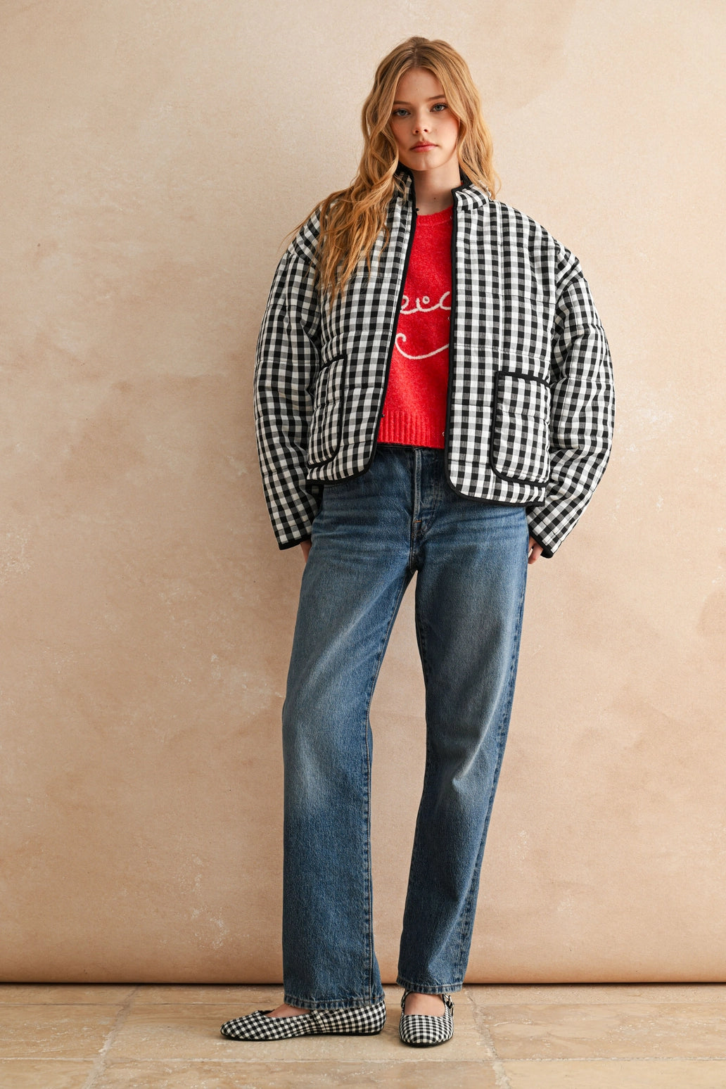 Timeless print. Elevated puff. Meet your new favorite cold-weather layer. The Corey Gingham Jacket features a bold black-and-white gingham check on a cozy quilted silhouette. The oversized cut and slightly cropped fit make it perfect for layering over everything from hoodies to holiday dresses. Finished with roomy front pockets, a high collar, and subtle contrast trim—this one gives main character energy on casual days and statement layering on styled-up nights.