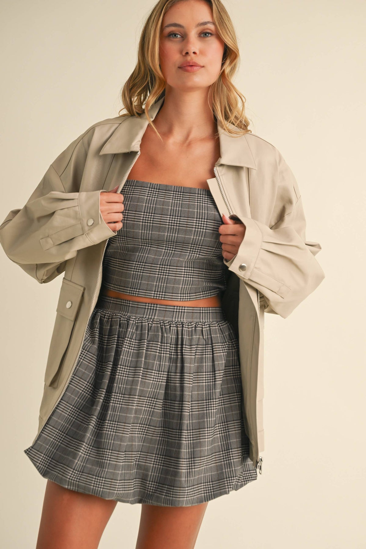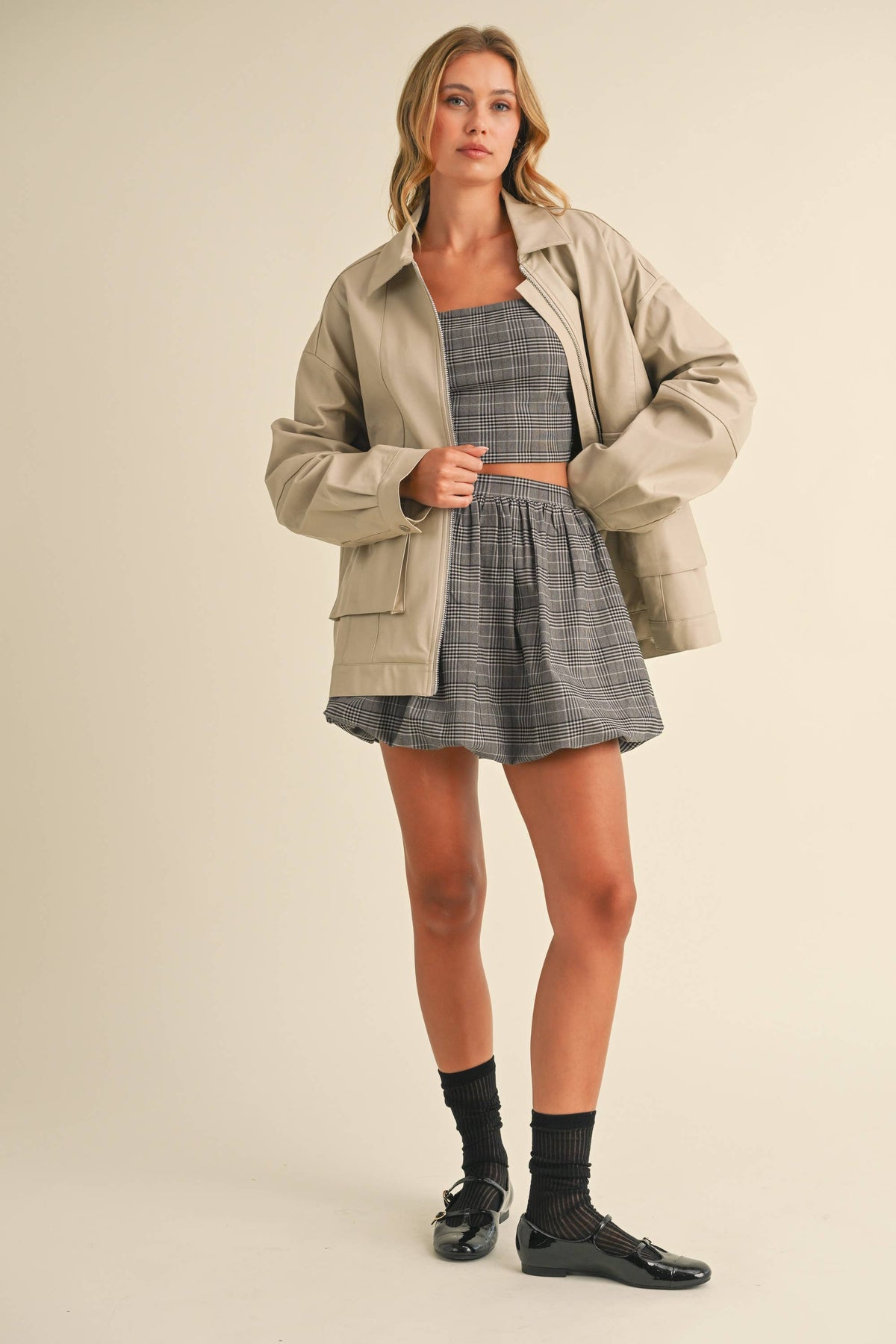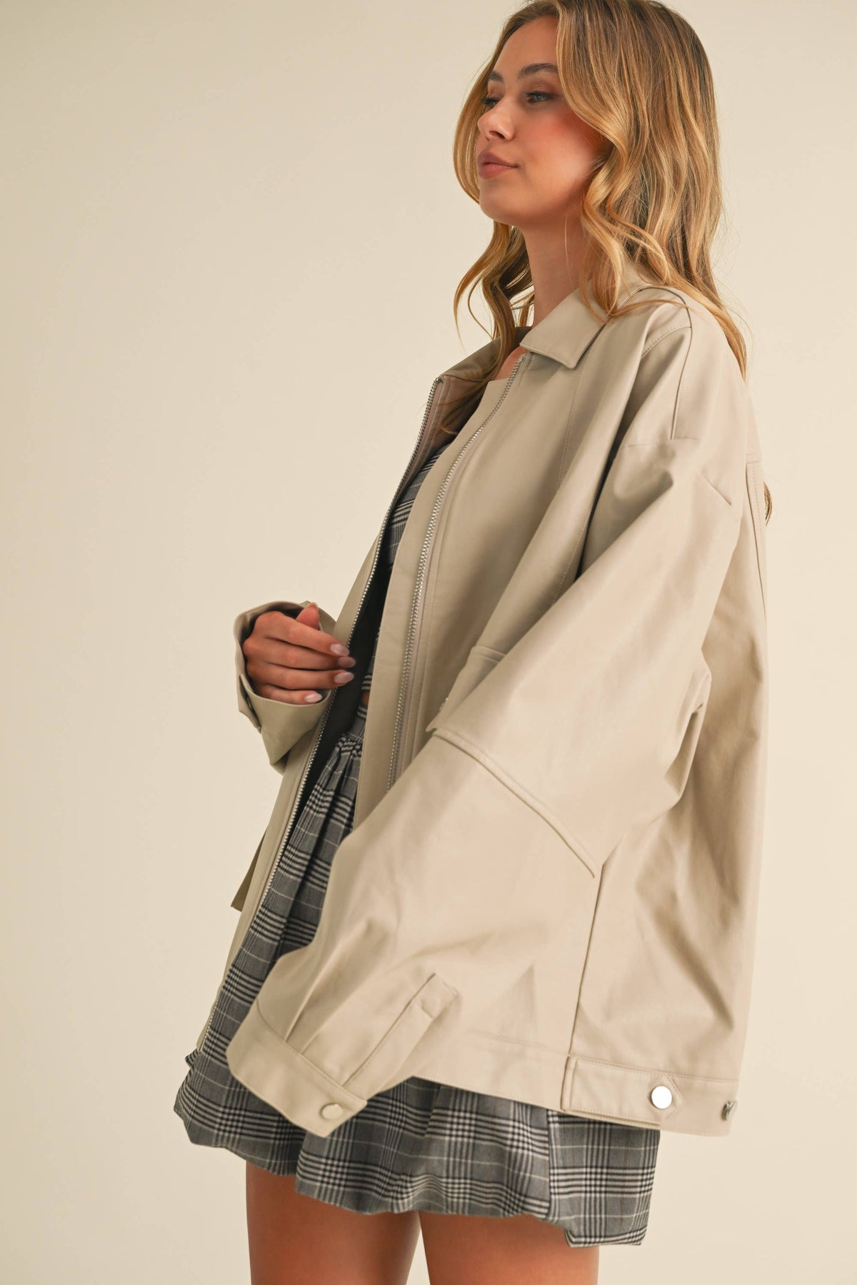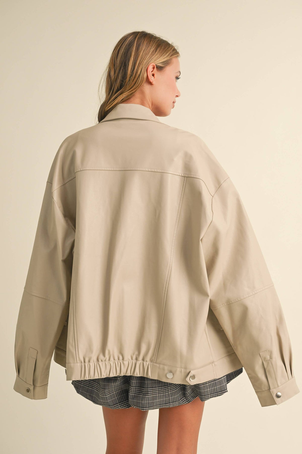 Cool-girl charm meets everyday ease. The Emerson Jacket is your new outerwear staple—crafted from smooth vegan leather with a subtle sheen and oversized flap pockets that bring the street-style energy. Its bomber silhouette adds a touch of structure while keeping things effortlessly laid-back. Lightweight yet luxe, this neutral-toned jacket layers over everything from crop tops to cozy knits.