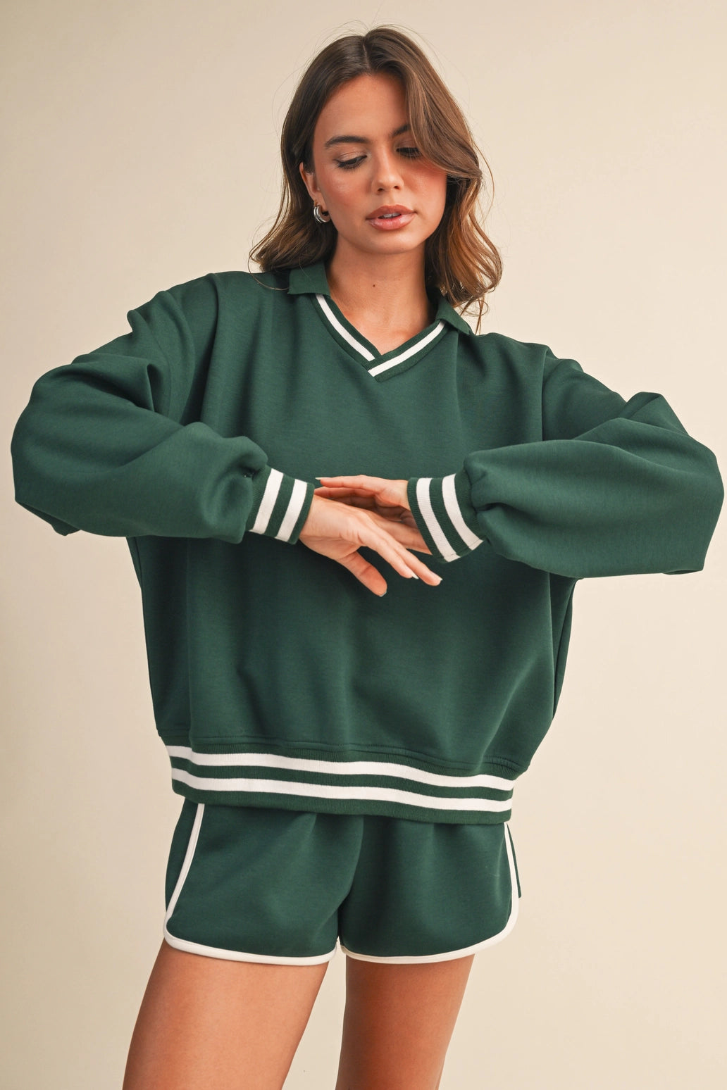 Meet the Conrad Set, your new off-duty uniform. This collared sweatshirt and shorts combo blends sporty detailing with an elevated, everyday feel. Designed in a smooth, mid-weight knit with striped contrast trim, it delivers that perfectly relaxed—but still put-together—look.