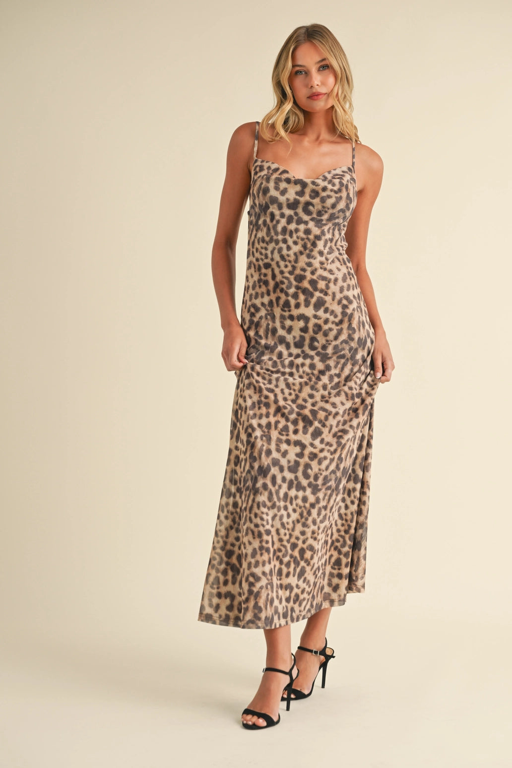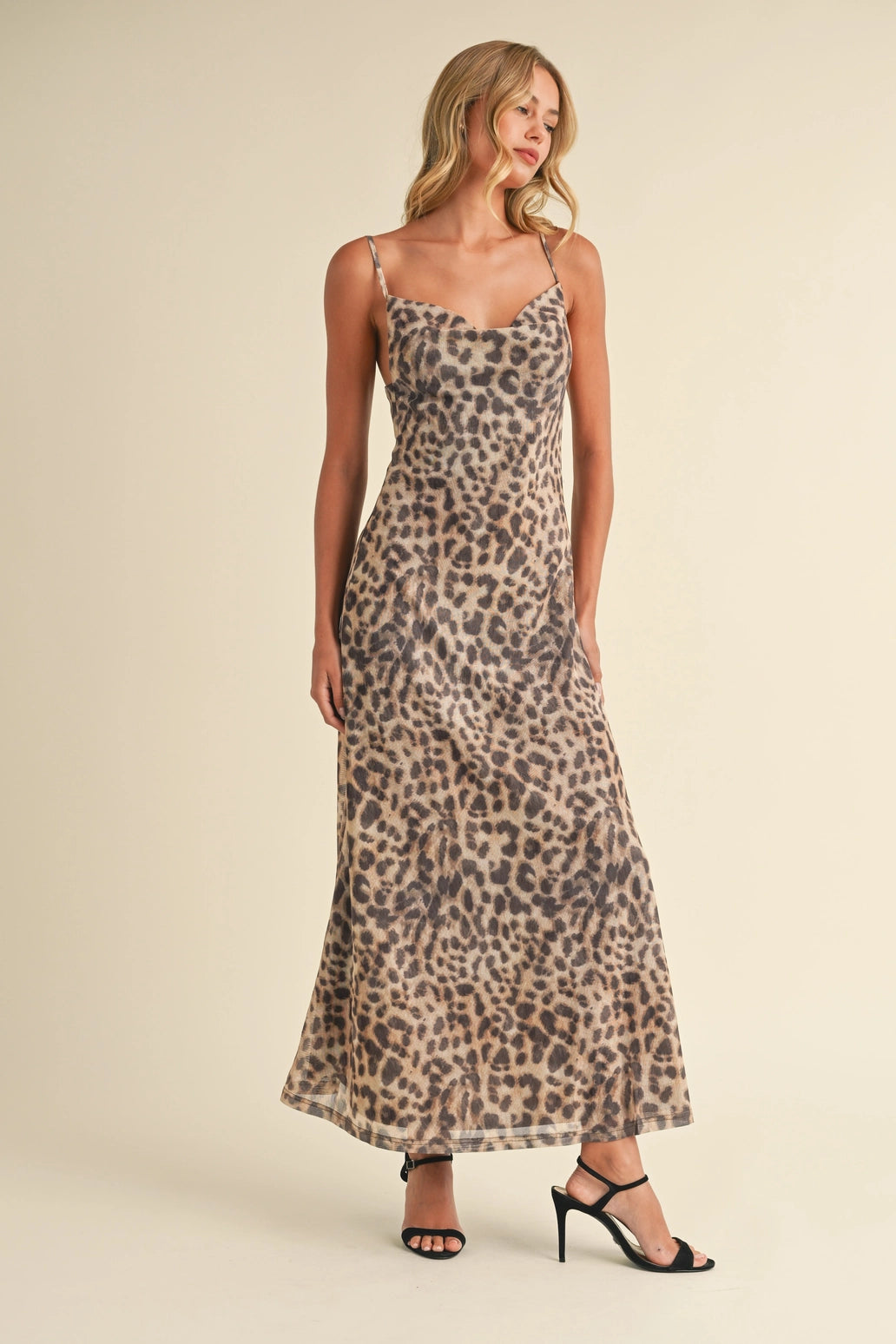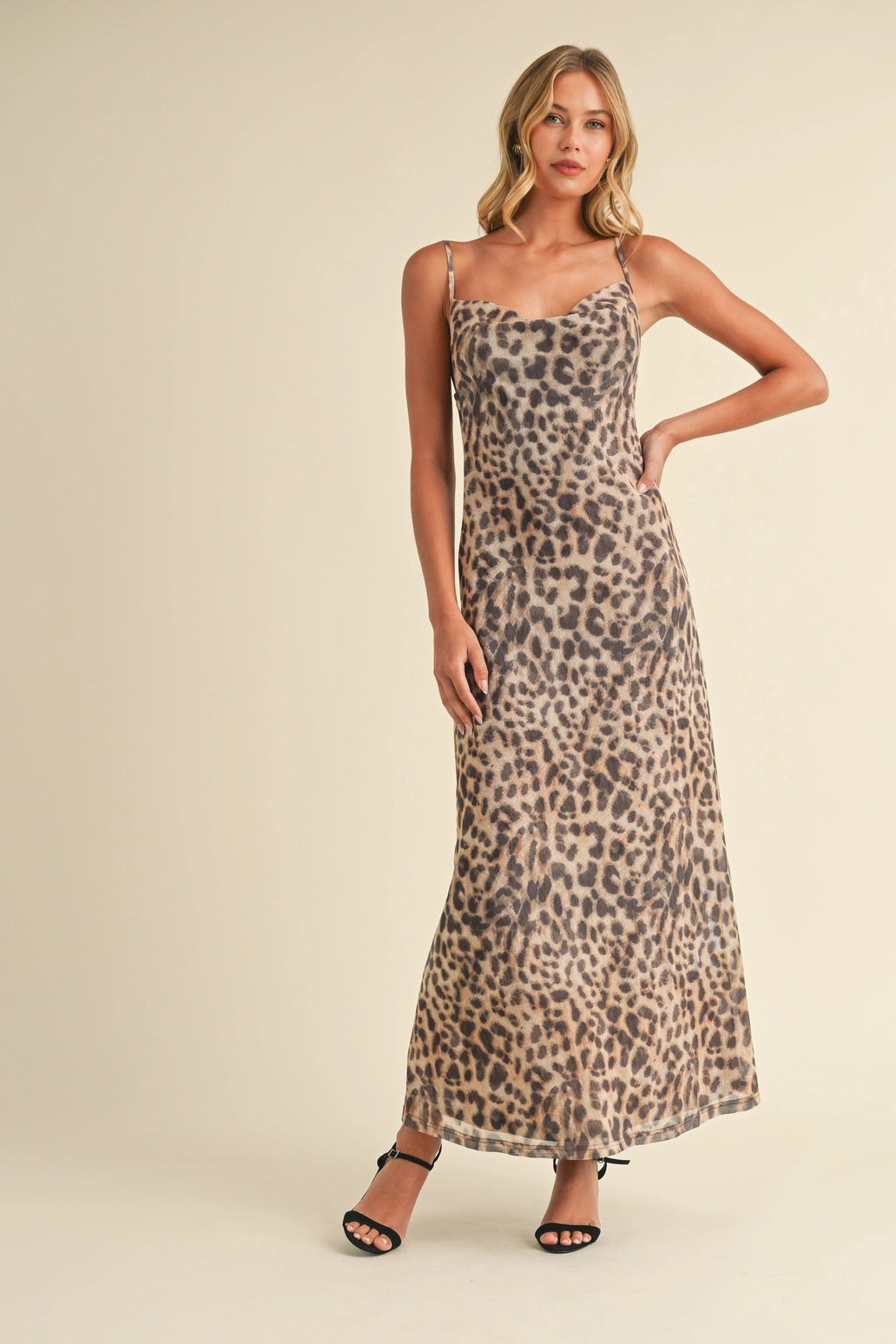 Slip into your wild side with the Crawford Dress — where bold meets effortlessly chic. Designed in a stunning leopard mesh print, this figure-skimming maxi features a soft cowl neckline and adjustable cami straps that cascade into a low scoop back. Whether you're headed to date night, girls’ night, or your next vacation dinner, this dress moves with you and turns heads while doing it.