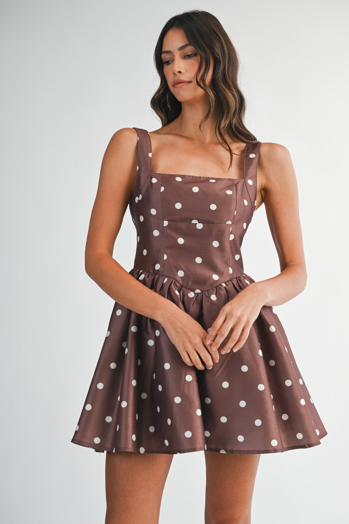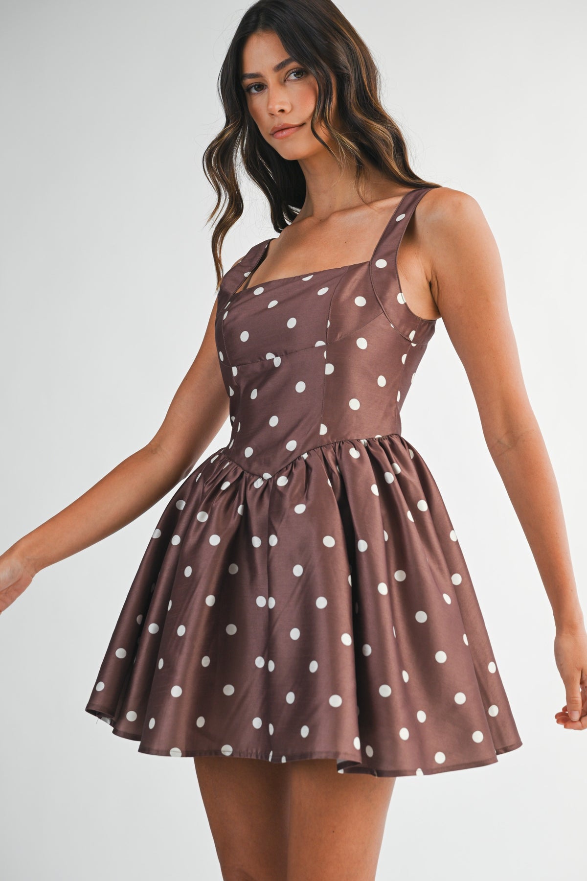 The Frankie Mini Dress is a playful take on retro glam. Featuring a chocolate brown taffeta fabric adorned with classic ivory polka dots, this flirty mini dress brings all the vintage vibes with a modern fit. The structured square neckline and fitted bodice create a flattering silhouette, while the voluminous flared skirt—with tulle mesh underneath—adds the perfect amount of drama for any occasion.