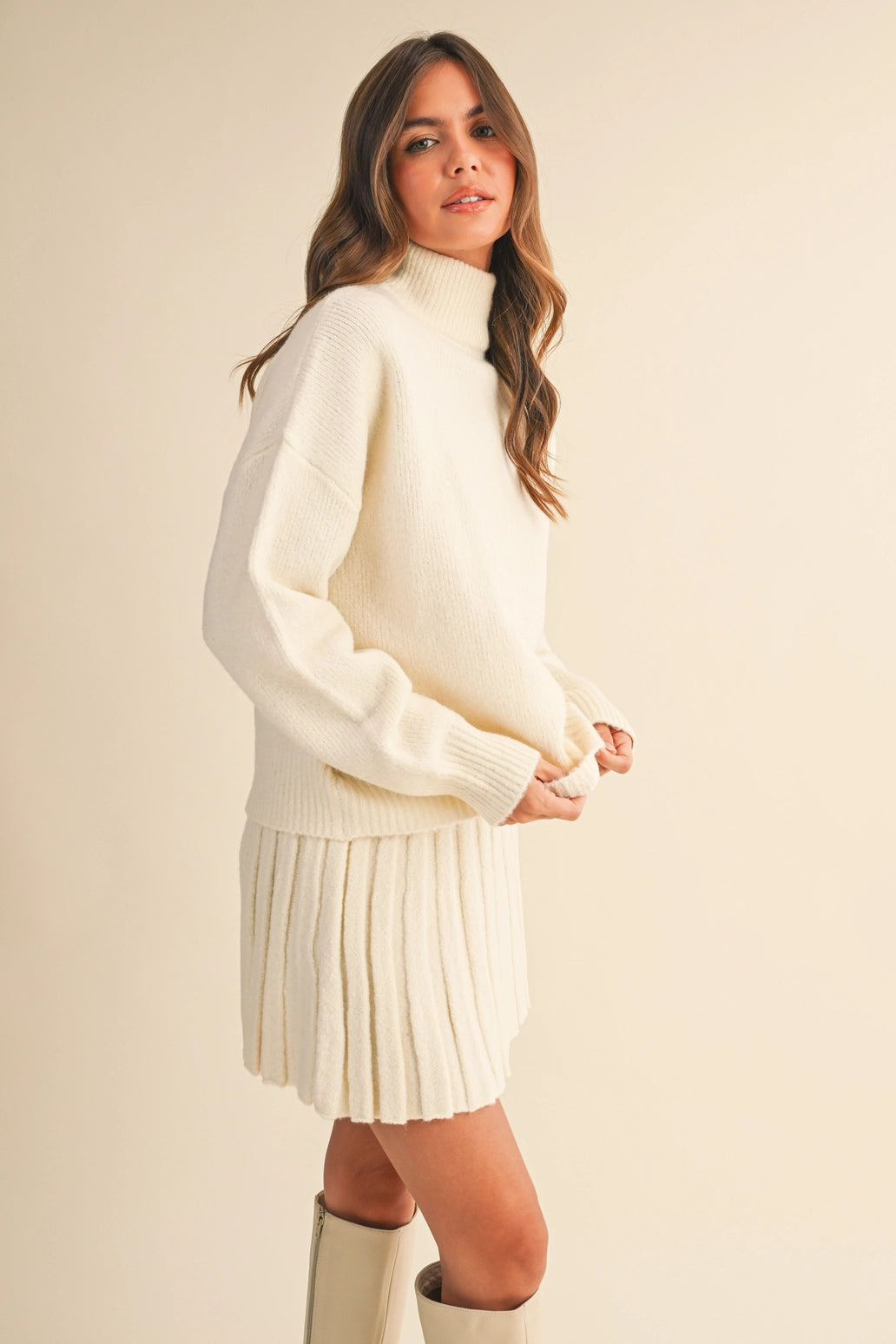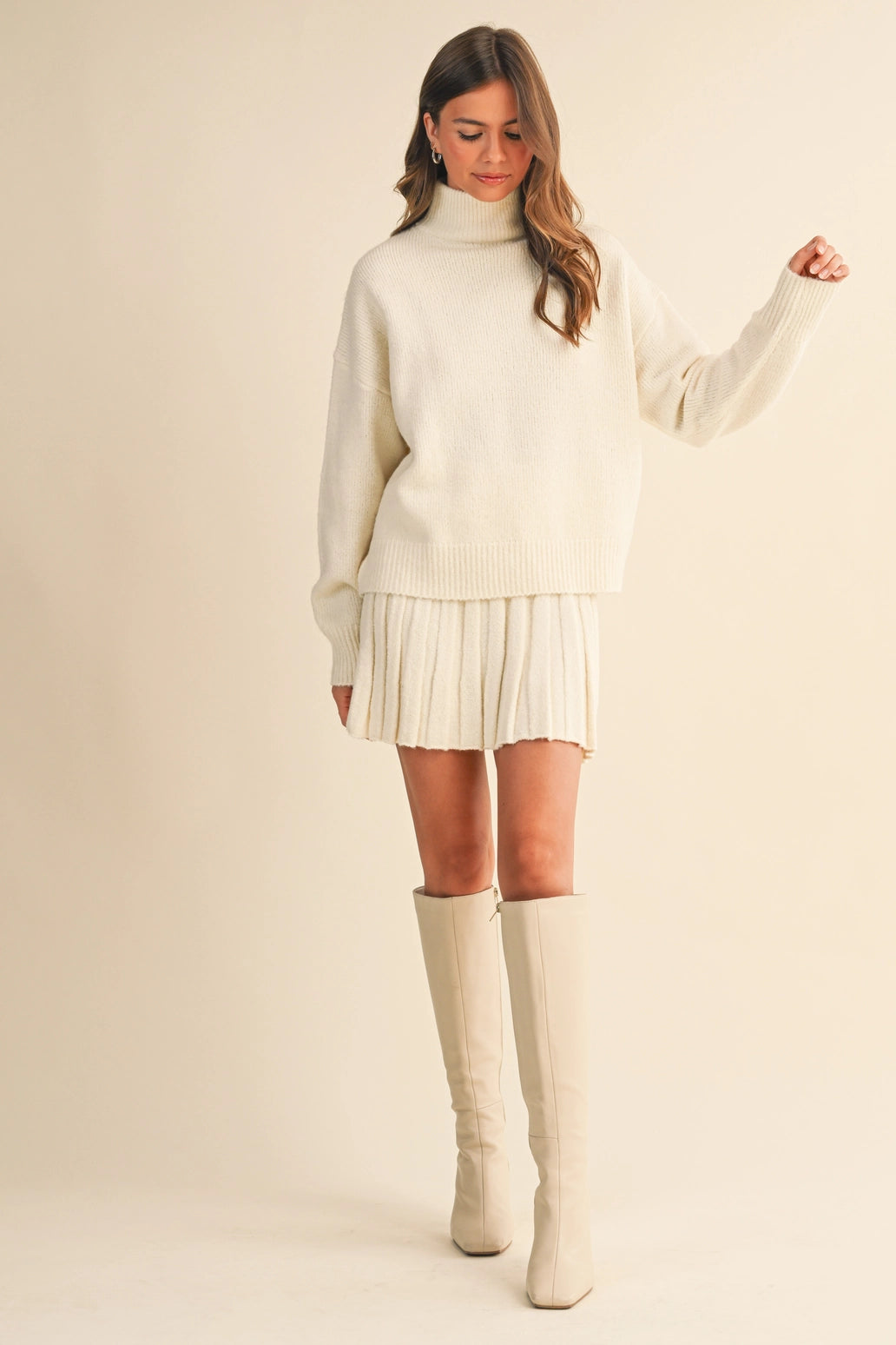 Your soft girl fall uniform has officially arrived. The Amersterdam Sweater Set in Cream brings all the cozy chic vibes you’ve been dreaming of. Designed with a chunky, oversized turtleneck sweater and a matching pleated A-line mini skirt, this ultra-soft knit set is as comfy as it is elevated. Wear them together for a monochrome moment, or style them separately to stretch your wardrobe all season long.