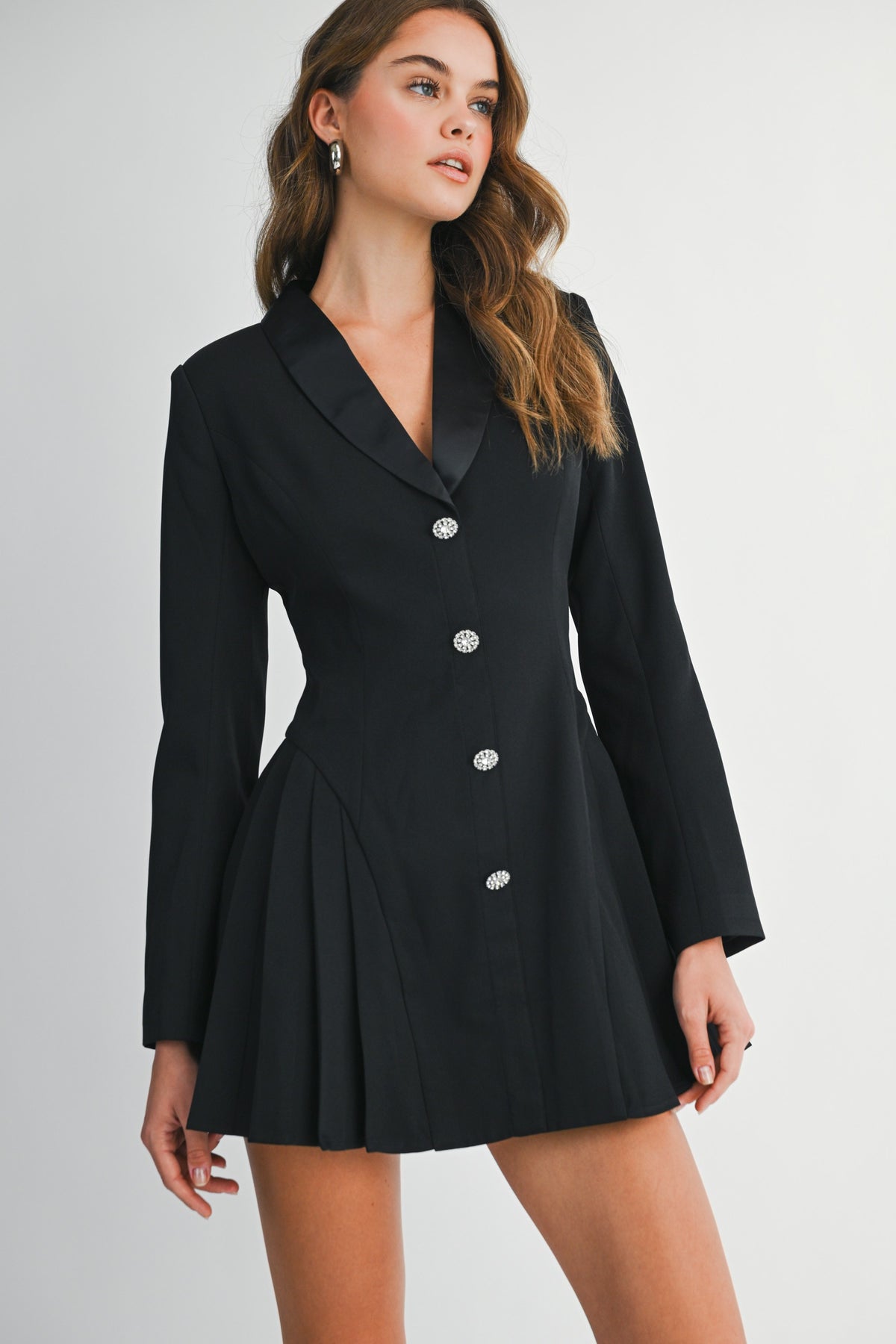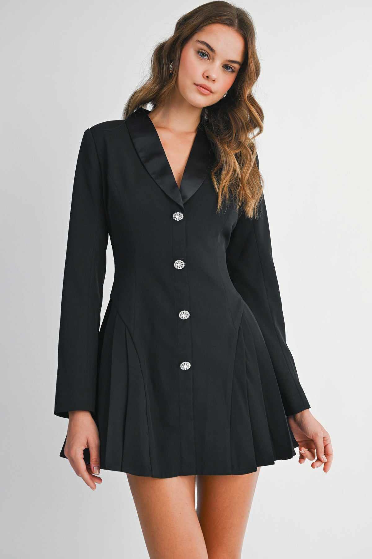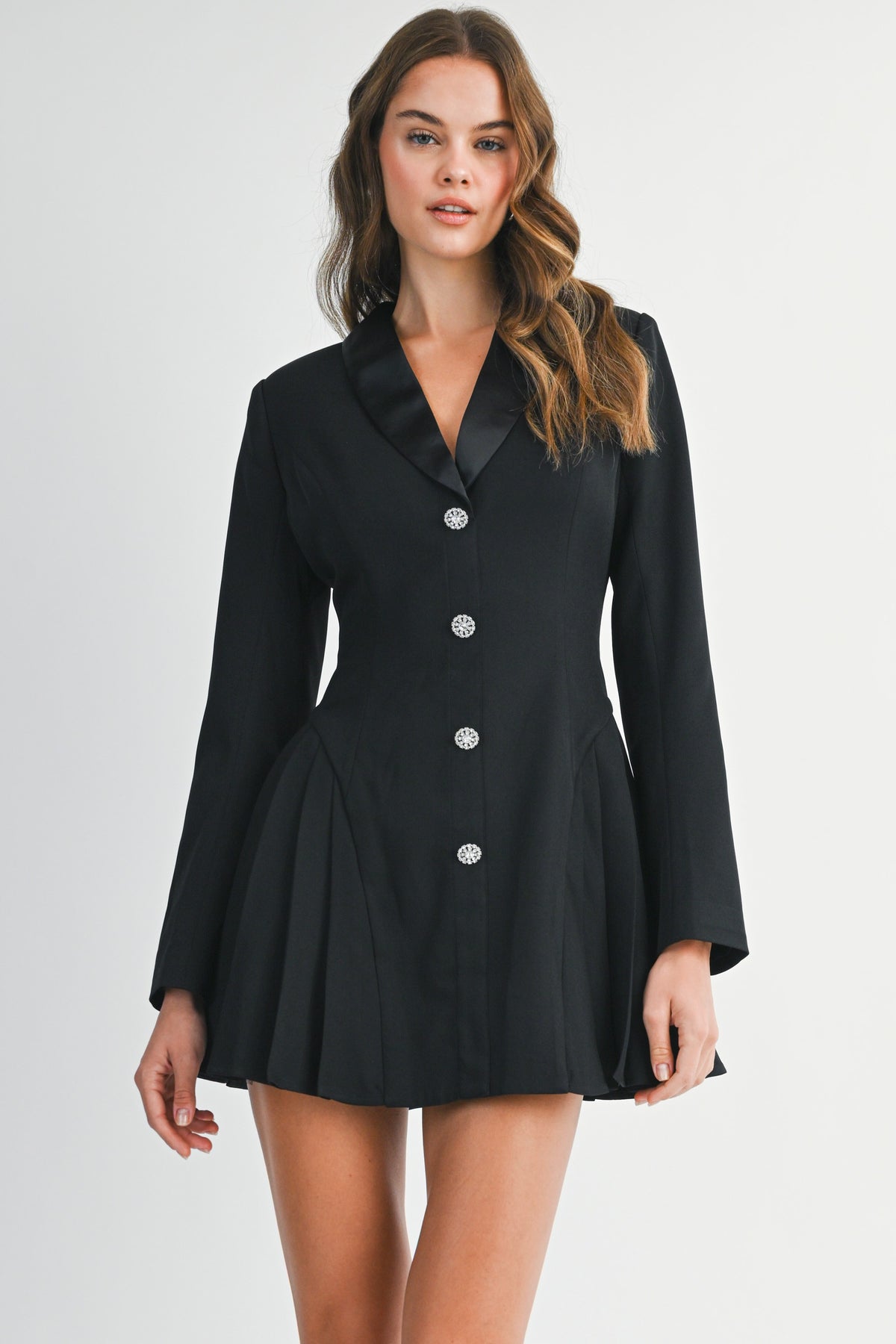 Command the room in the Bobbi Blazer Dress—a structured yet feminine twist on classic tailoring. This blazer-inspired mini dress features a sculpted fit-and-flare silhouette with a notched lapel collar trimmed in luxe satin. The waist is sharply tailored to flatter, flaring into a softly pleated skirt that moves with intention.