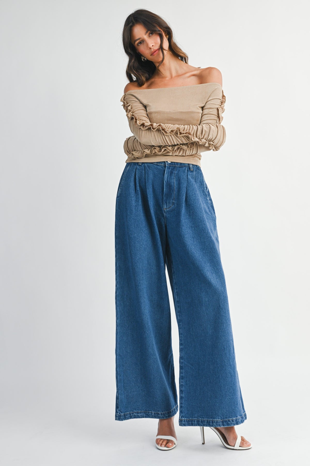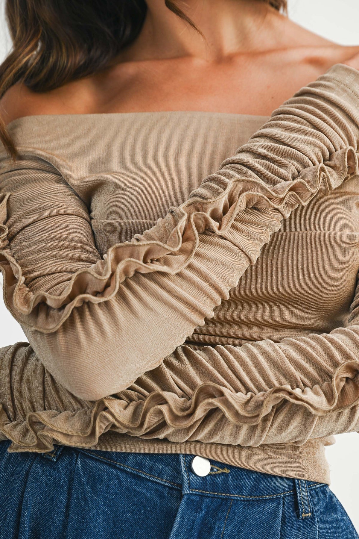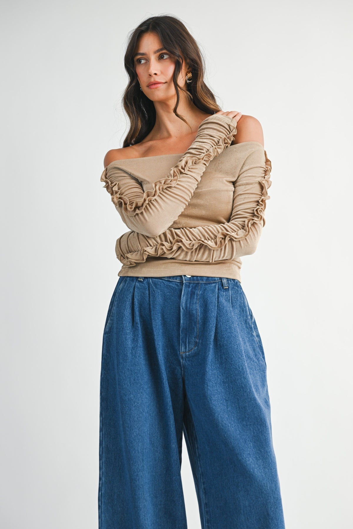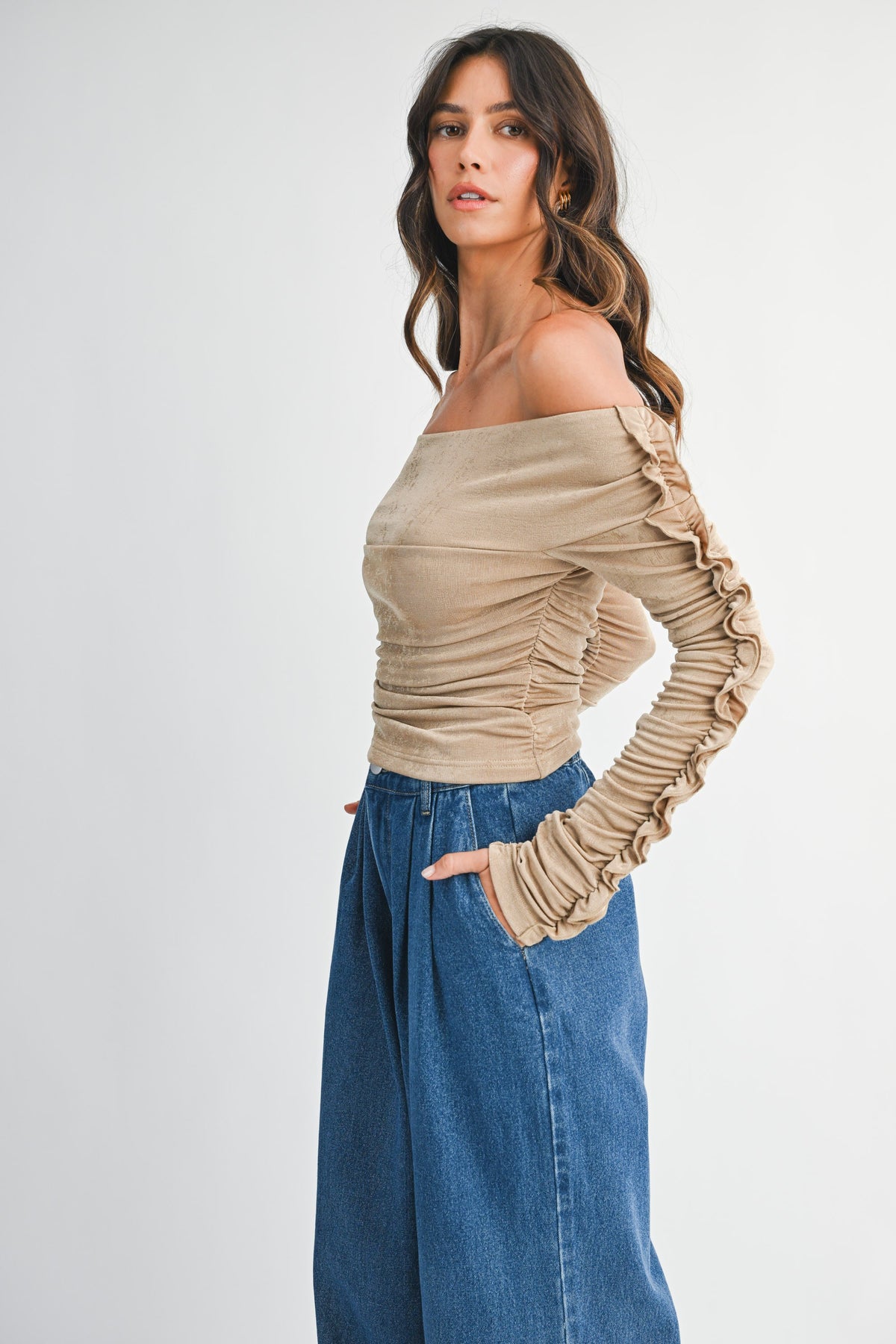 Make a sleek statement in our Kimberly Off The Shoulder Top — a bold blend of sultry and sophisticated. This long sleeve slinky knit top features a flattering off-the-shoulder neckline and ruched sleeves finished with feminine ruffle trim. Whether you dress it up with faux leather or keep it casual with denim, Kimberly turns heads every time.