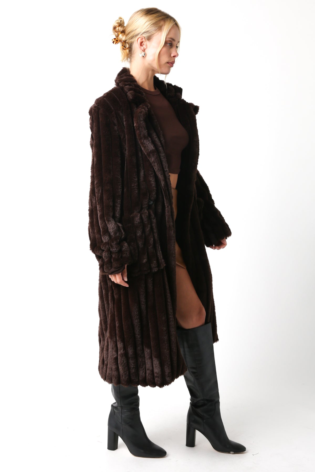 The Maddox Fur Coat is the statement piece your winter wardrobe has been waiting for. Designed in a rich dark chocolate hue with plush faux fur and an ultra-longline silhouette, this coat brings high fashion energy to the chilliest of days.