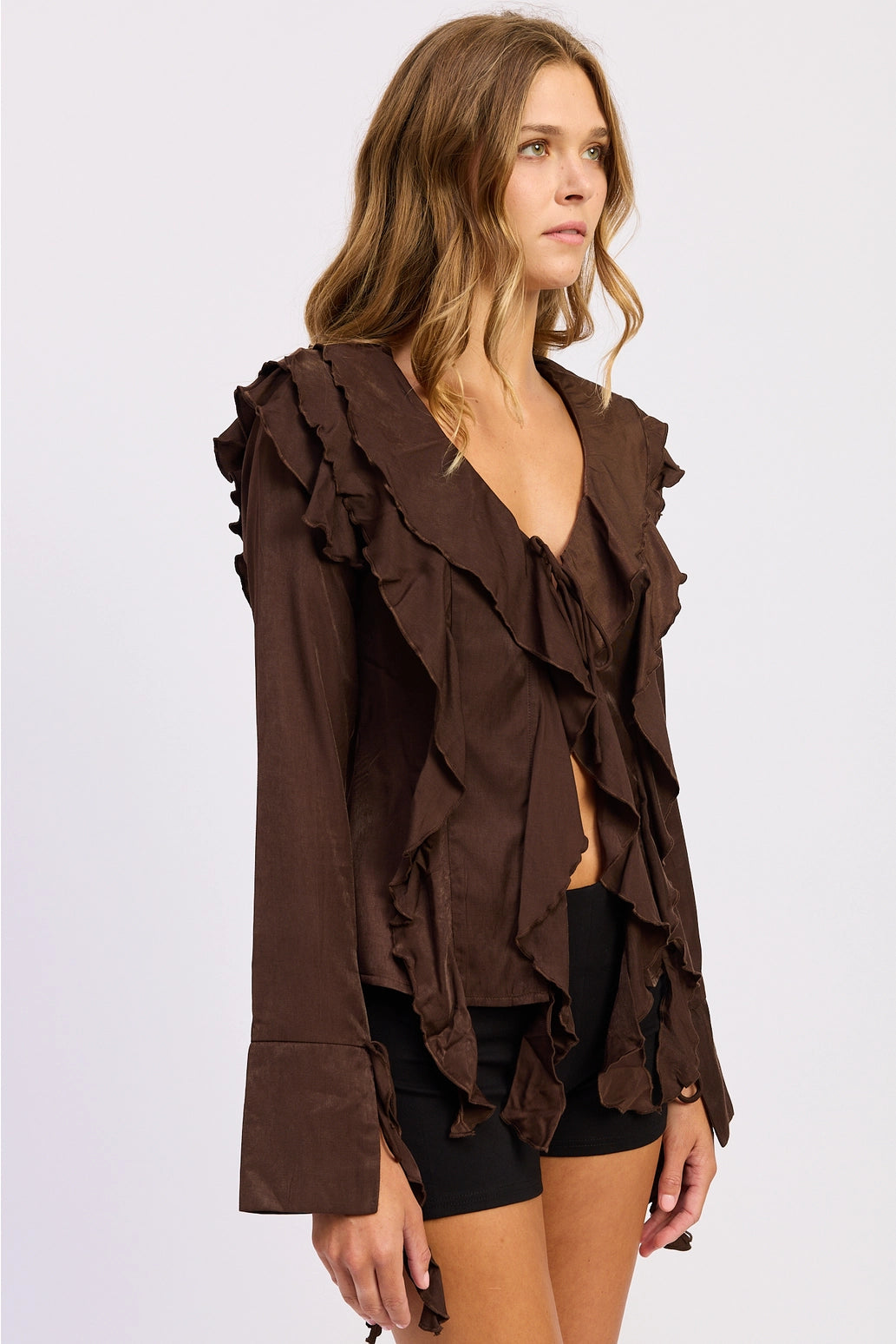 Designed in a rich mocha tone, this piece features a flattering v-neckline and adjustable tie front closure, giving you styling versatility whether worn open or closed. Cascading ruffles run from shoulder to hem, creating texture and flow, while lace-up cuffs add a flirtatious final touch.