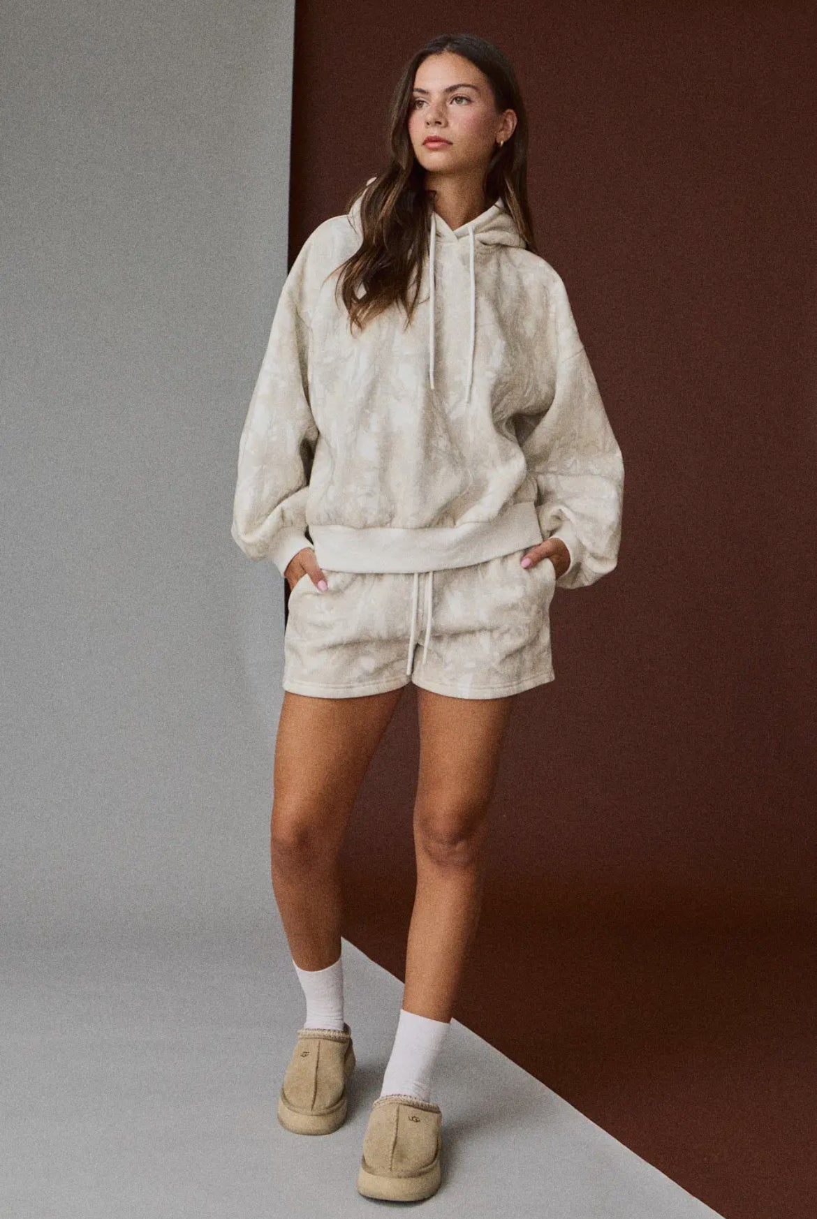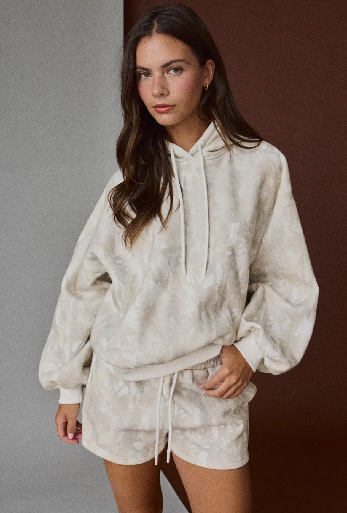 Meet your new favorite neutral lounge set—the Pearson Camo Set now with a Hoodie. This dreamy duo features a soft brushed sweatshirt and matching shorts in a tonal, barely-there camo print that feels as elevated as it is effortless. The oversized hoodied top offers slouchy, off-duty energy with balloon sleeves and a ribbed hem, while the high-waisted shorts keep it flattering with an elastic drawstring waistband and side pockets. Whether you’re weekend lounging, running errands, or styling it up with sunnies and sneakers, this set brings cozy-chic to a whole new level.