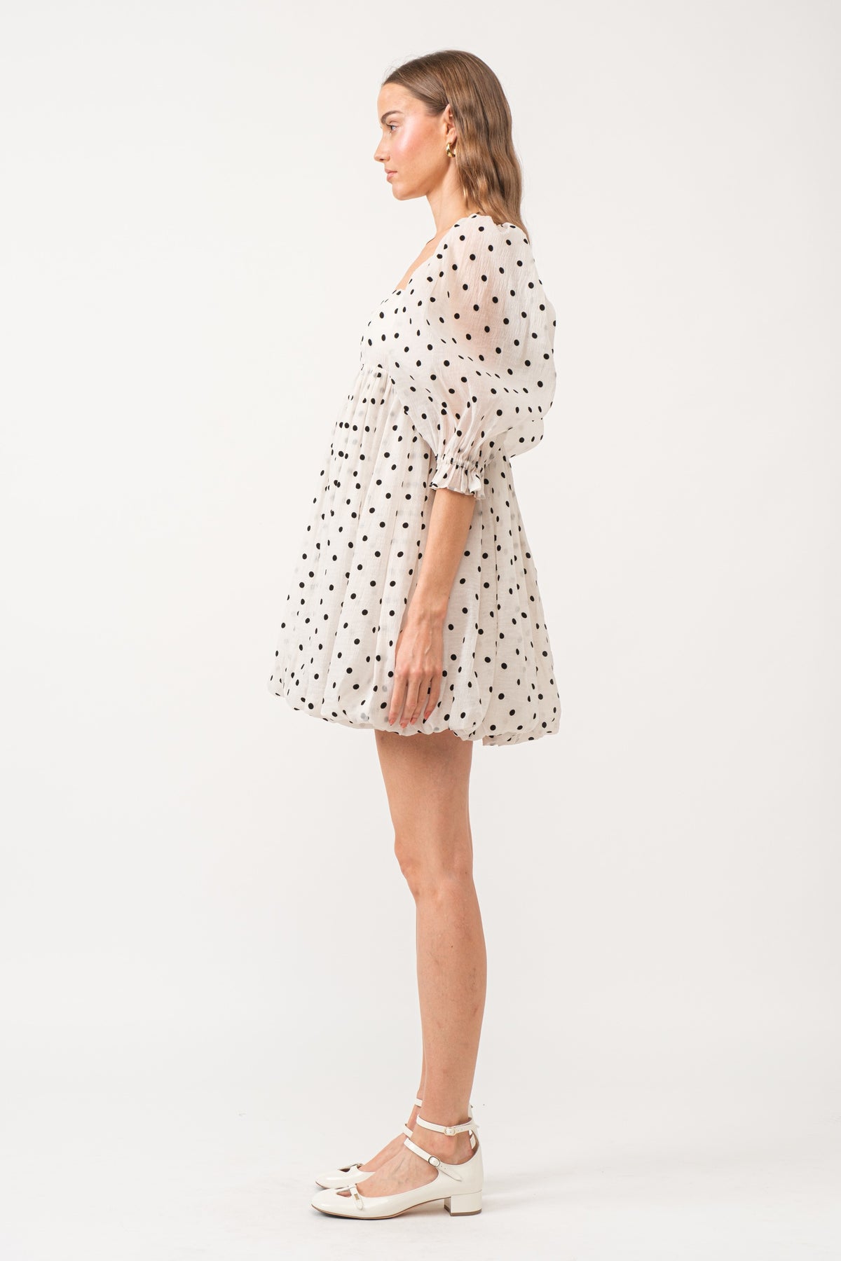 This mini dress is perfect for adding a touch of fun to any occasion!" With its bubble hem and playful polka dot pattern, the Jacquelyn Dot Dress exudes a sense of femininity and trendiness. The mesh puff sleeves add a hint of girly, while the babydoll design creates a flattering and comfortable silhouette. Don't miss out on this versatile and limited edition piece!