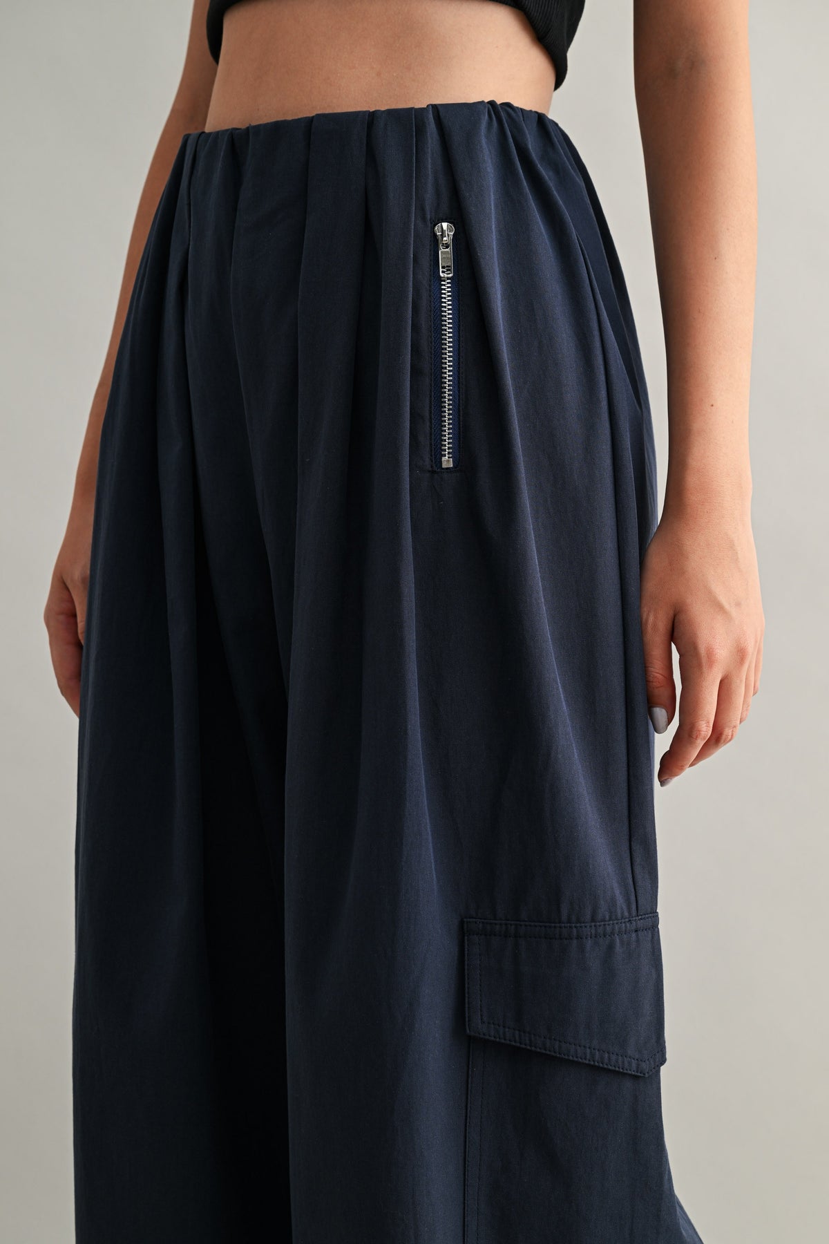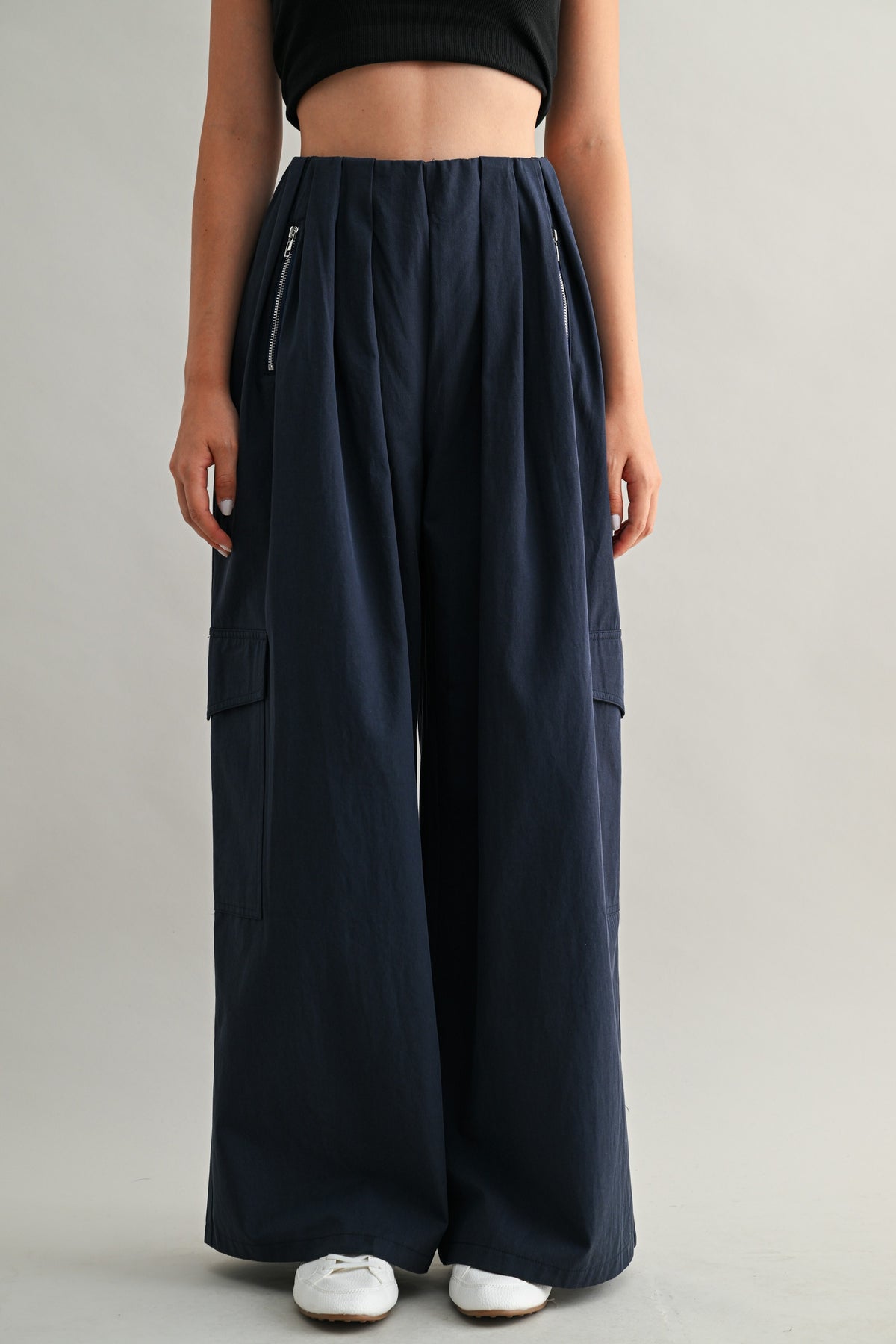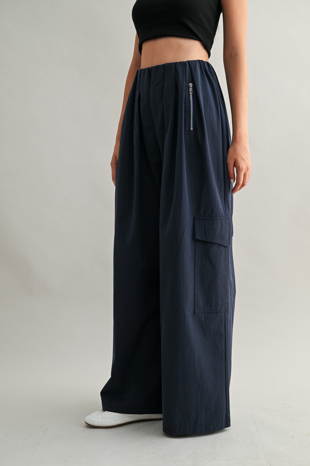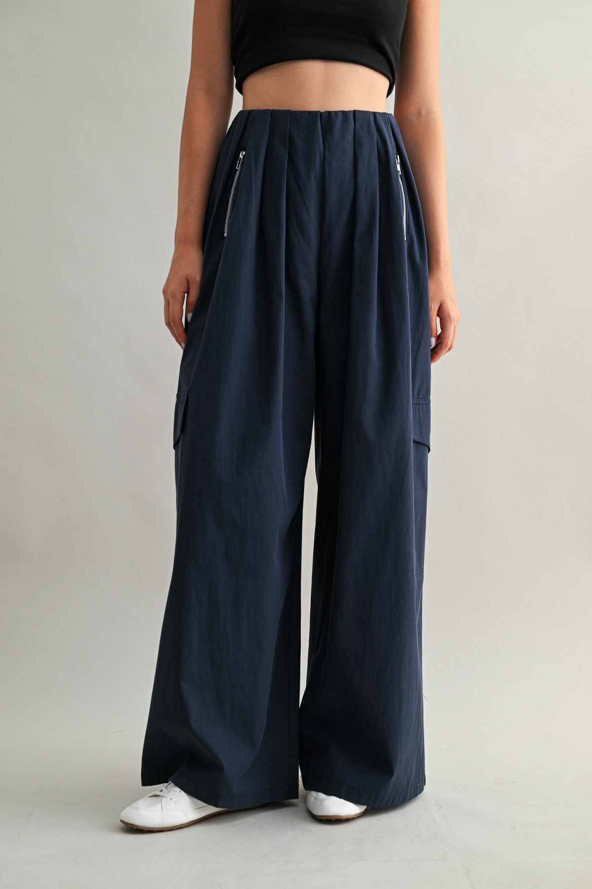 Vertical zipper pockets at the waist add subtle hardware detail, while oversized cargo pockets at the legs bring that understated utility vibe — without overwhelming the look.