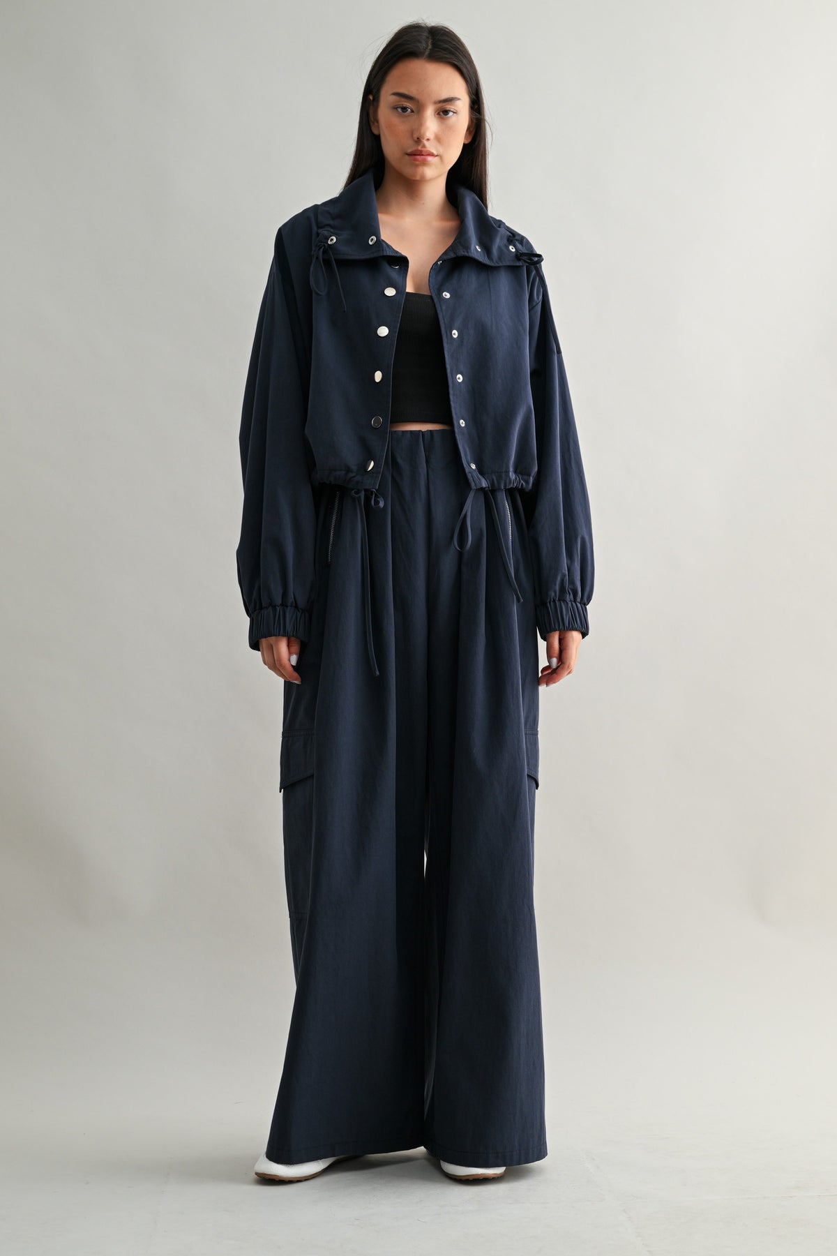 The Avani Cargo Pant blends effortless structure with modern edge. Designed with a comfortable pull-on elastic waistband, these wide-leg trousers feature soft front pleating for fluid movement and a clean, elongated silhouette.