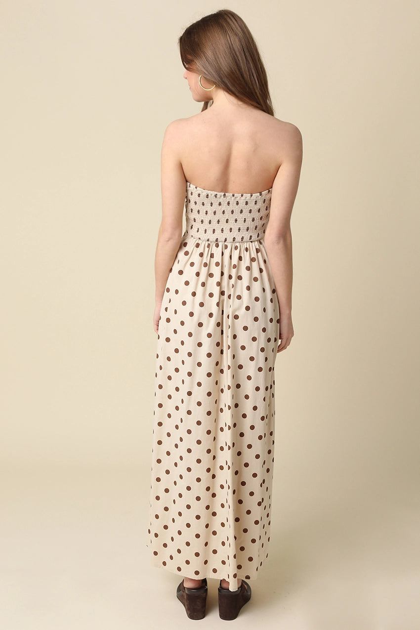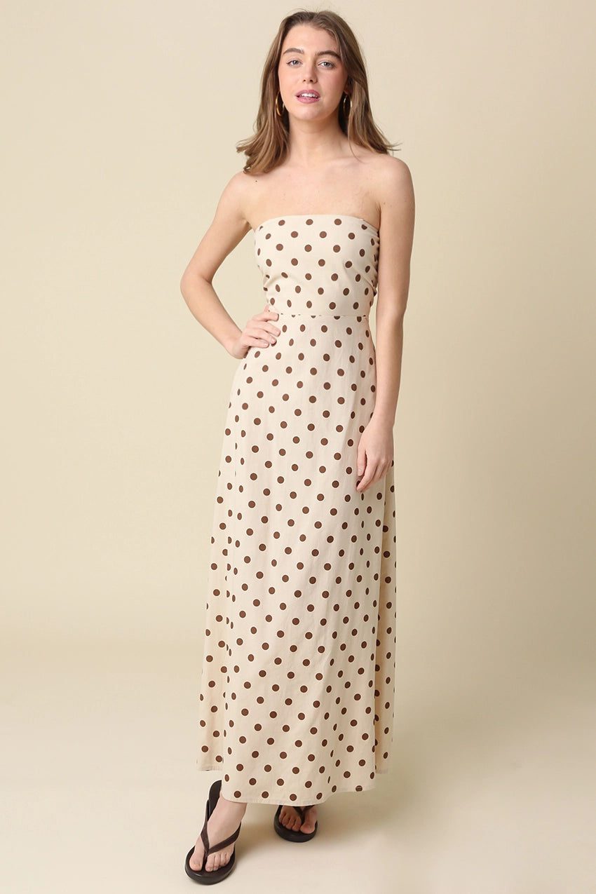 The Brynn Strapless Polka Dot Dress is your timeless summer statement — designed in a breathable cotton-linen blend with classic neutral polka dots. The strapless neckline keeps the silhouette clean and refined, while the full maxi length creates graceful movement with every step.