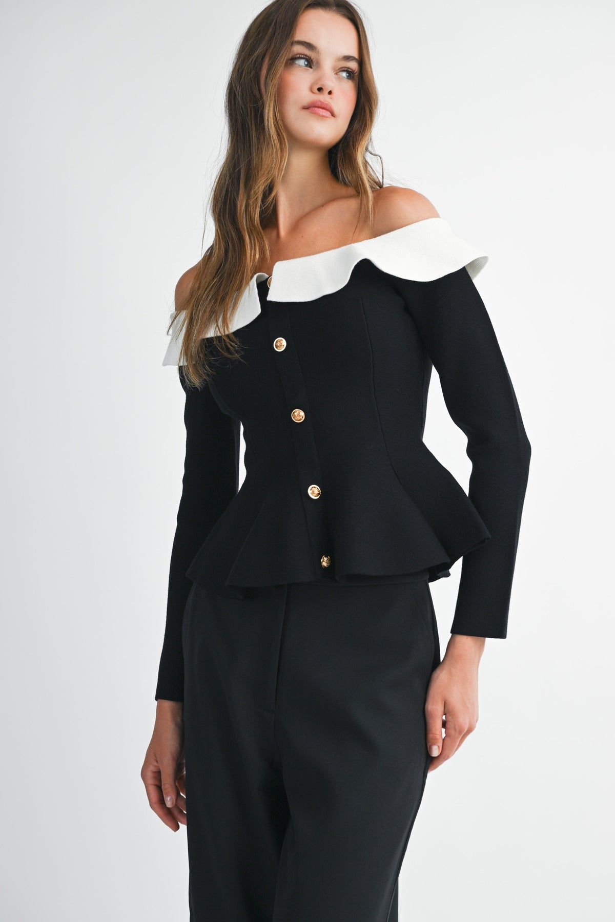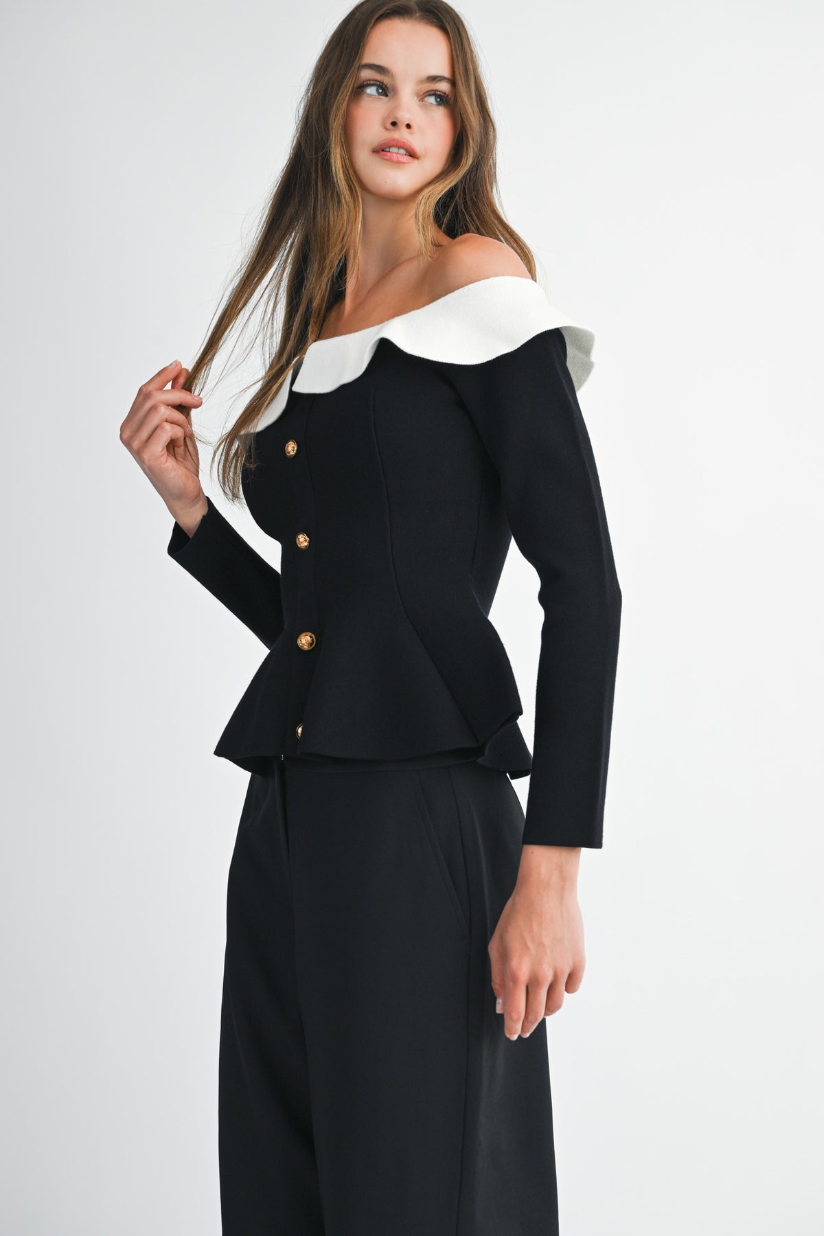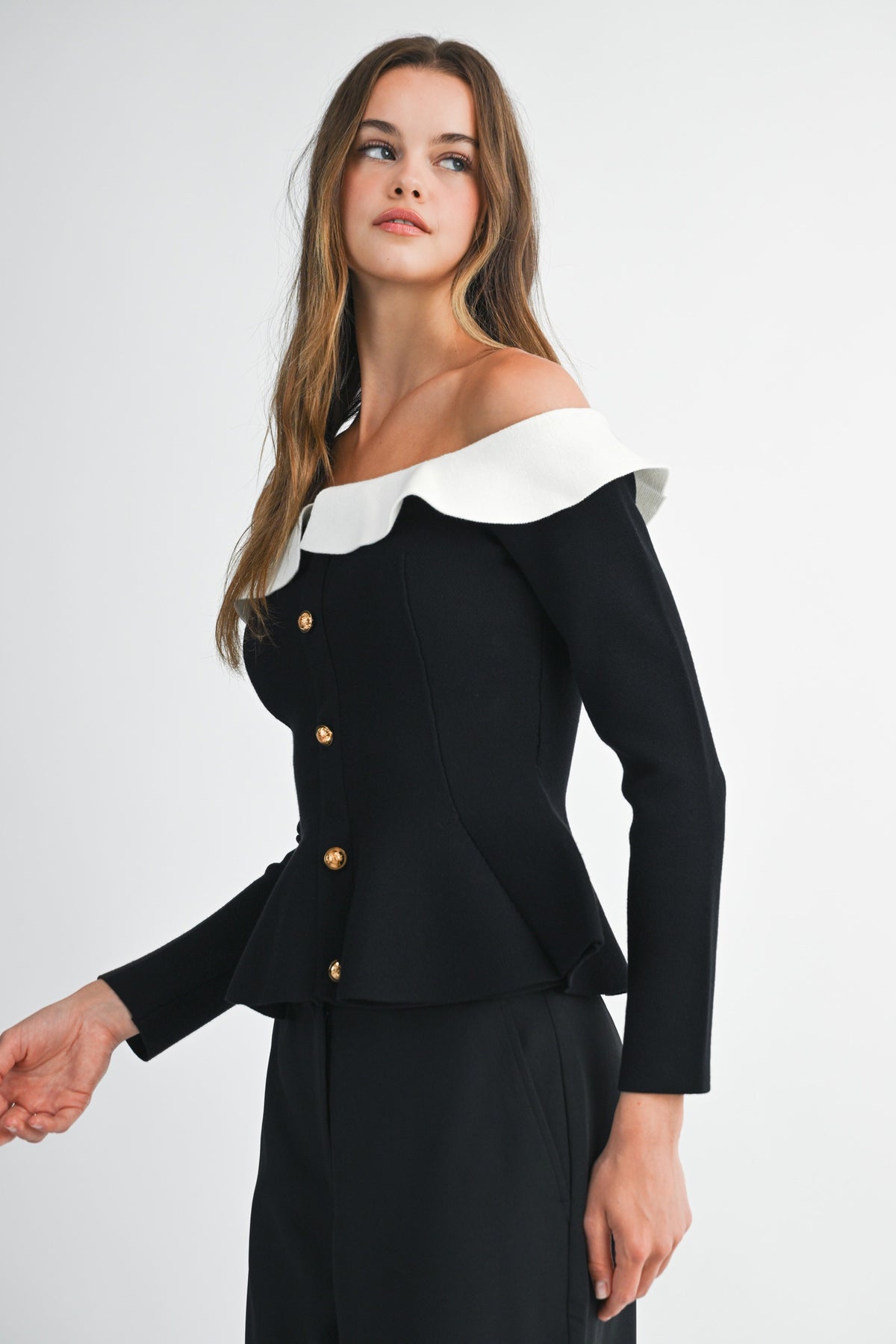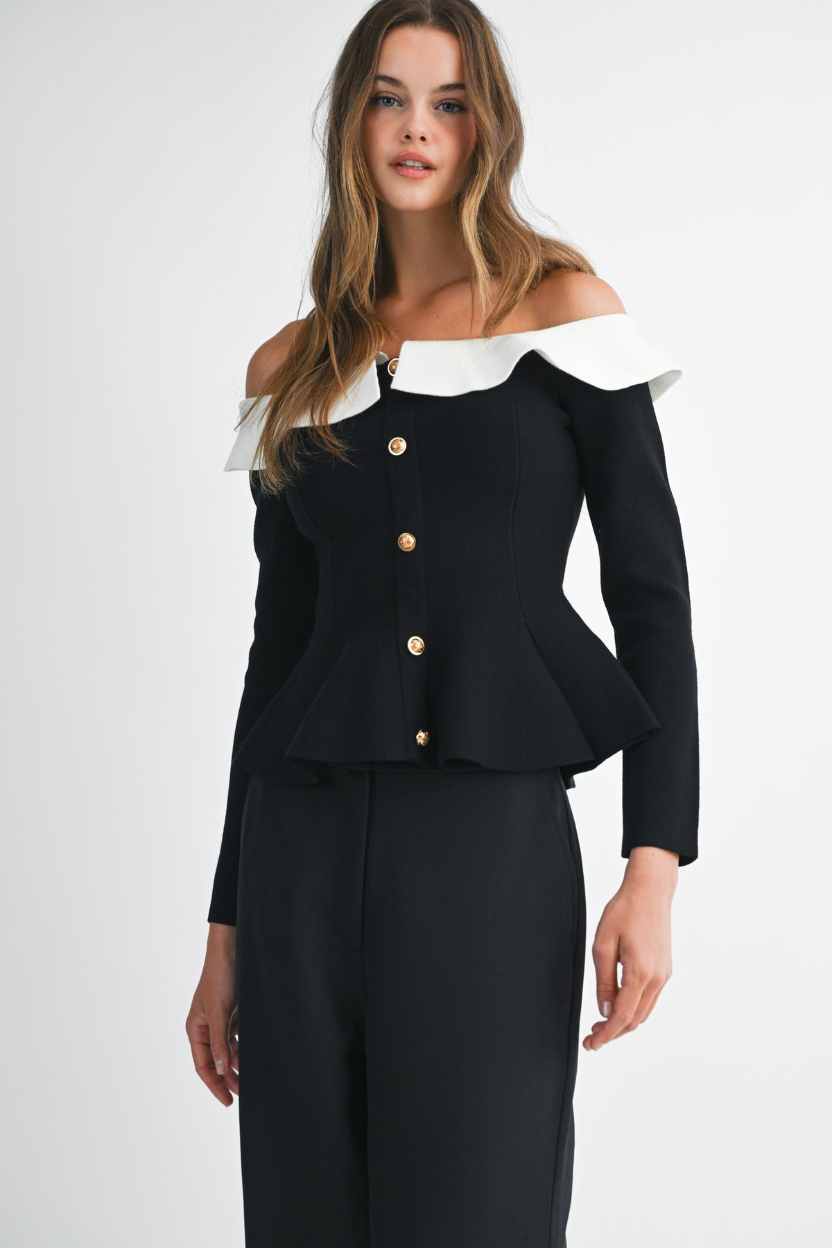 Elevated elegance meets everyday edge. The Camille Peplum Top features a sculpted off-the-shoulder neckline framed by a soft contrast ruffle collar, creating a striking silhouette that feels both vintage and modern. The gold statement buttons cascade down the front, adding a touch of luxe. Fitted through the waist with a flared peplum hem to flatter every curve.
