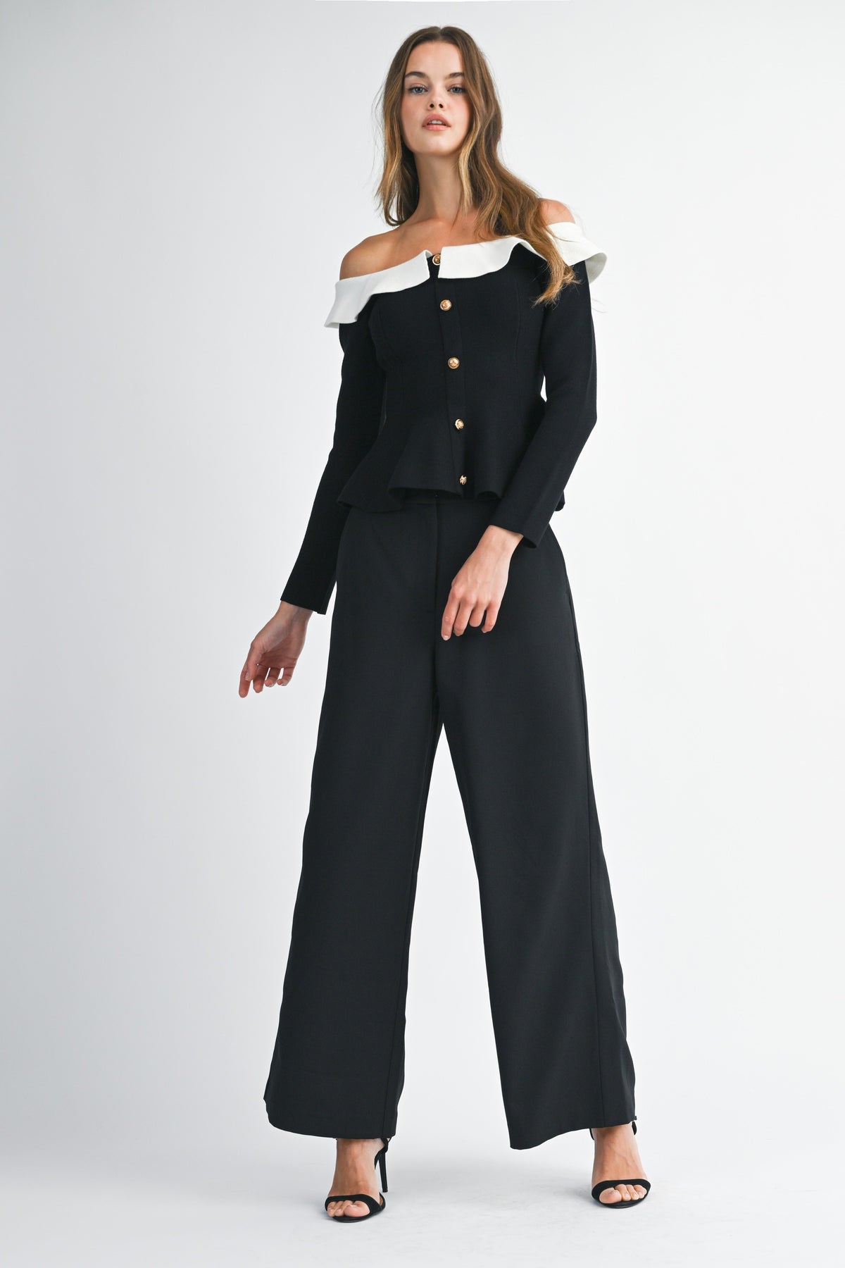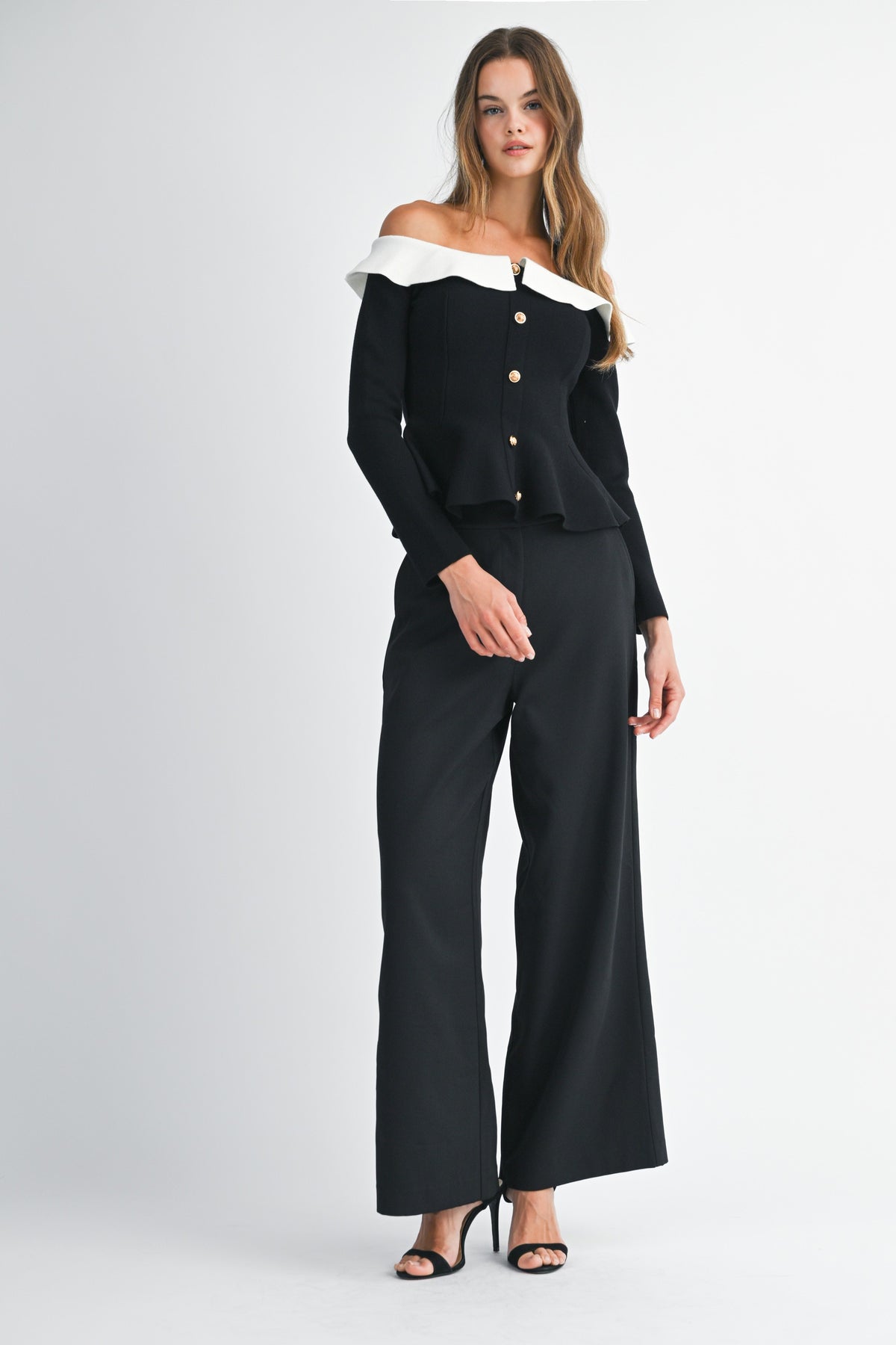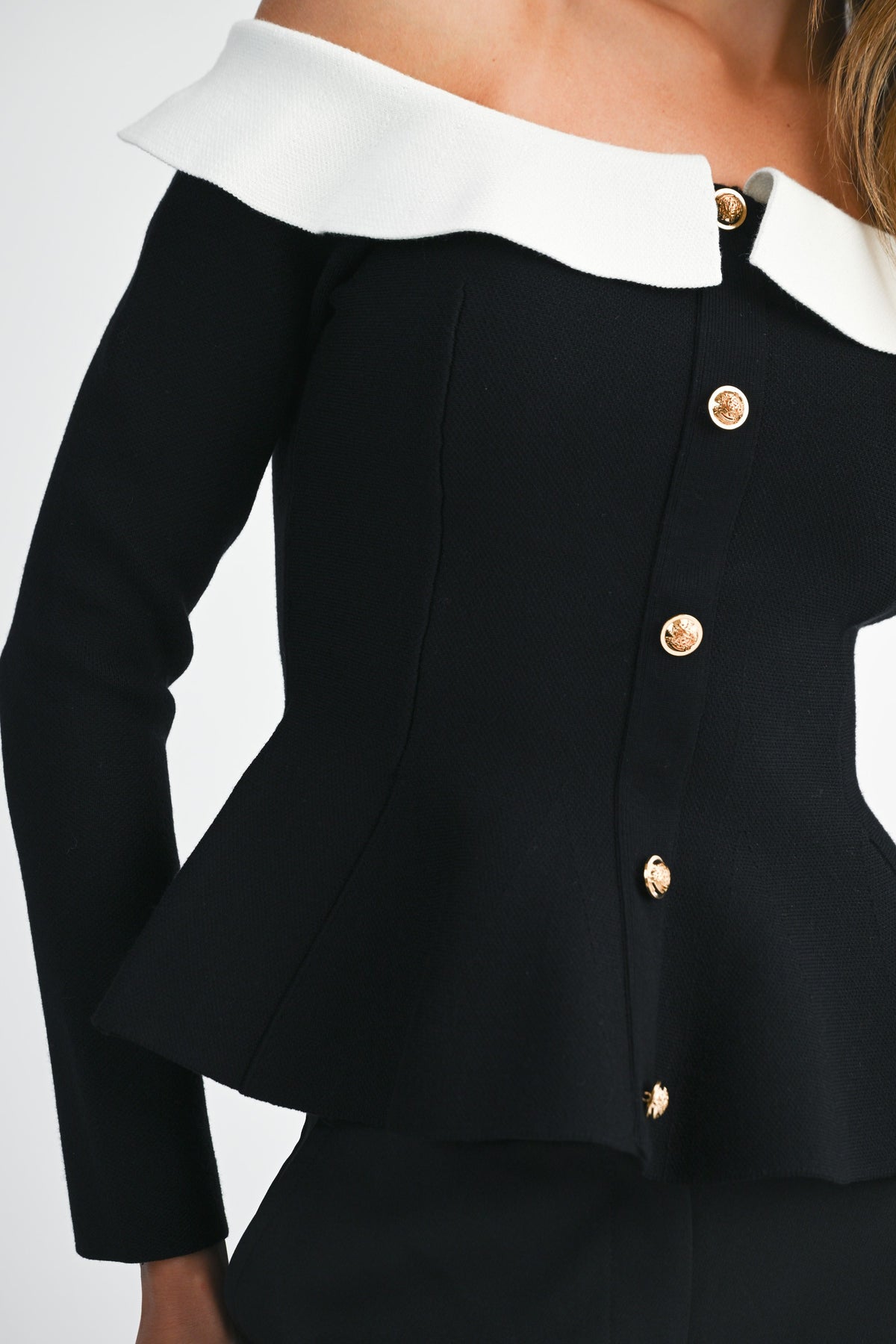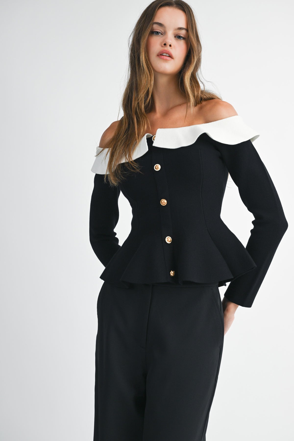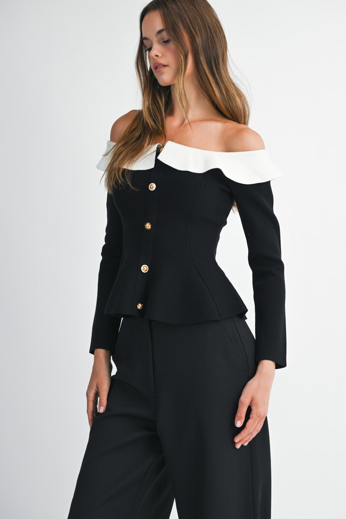 Elevated elegance meets everyday edge. The Camille Peplum Top features a sculpted off-the-shoulder neckline framed by a soft contrast ruffle collar, creating a striking silhouette that feels both vintage and modern. The gold statement buttons cascade down the front, adding a touch of luxe. Fitted through the waist with a flared peplum hem to flatter every curve.