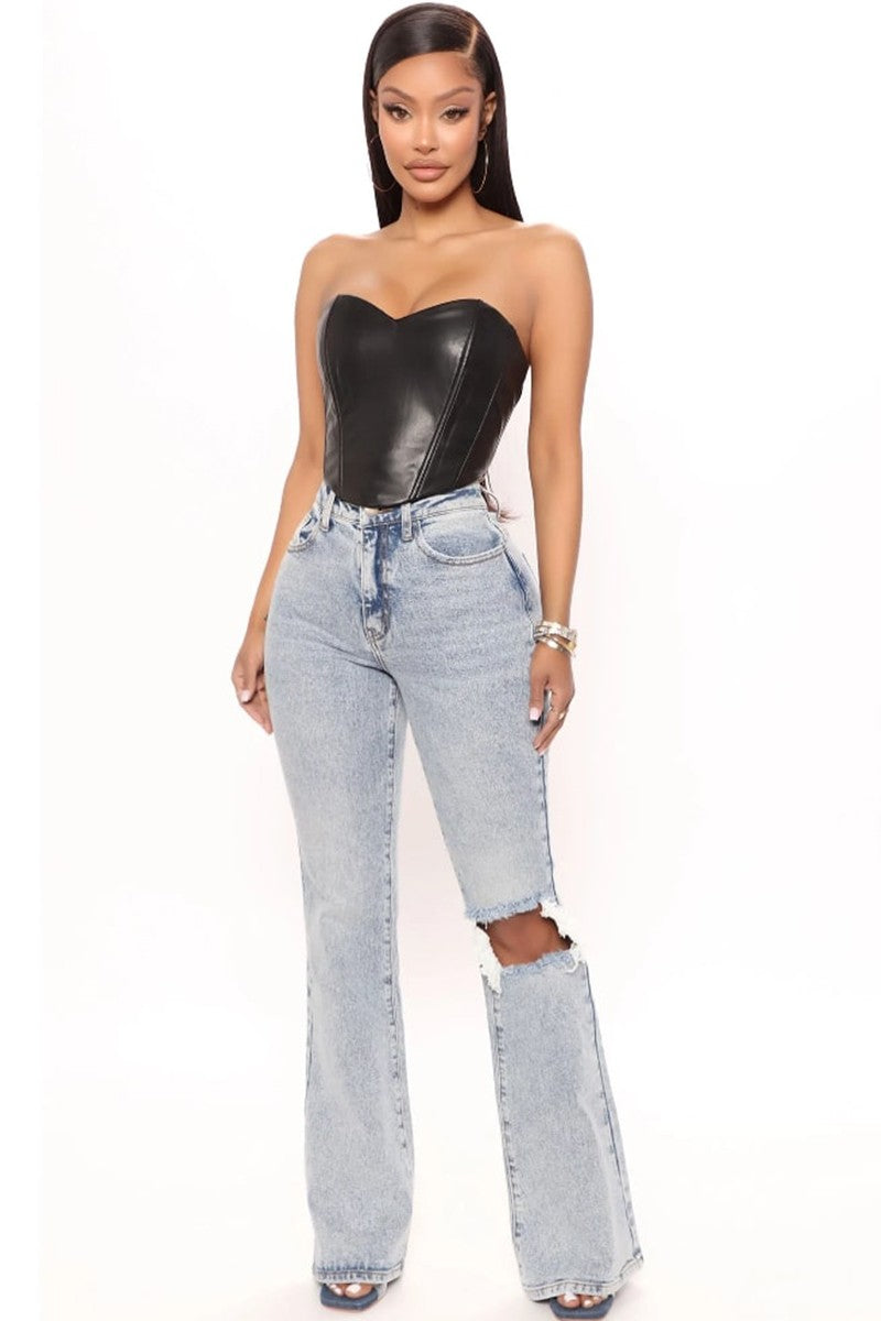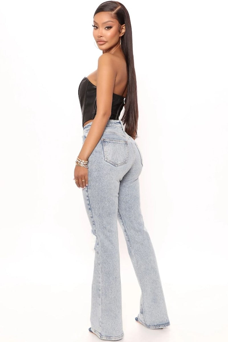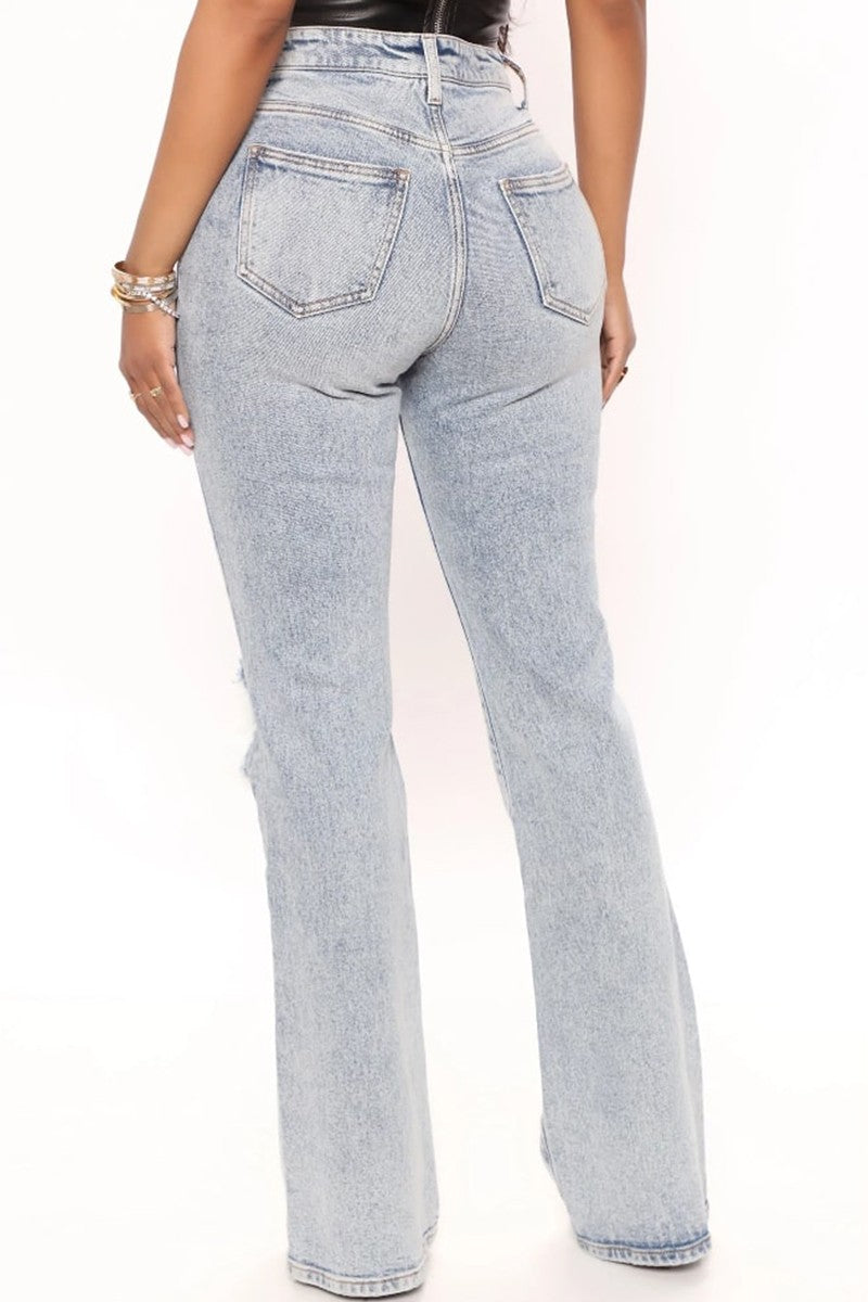Cassidy Jeans are new light medium wash denim jeans that are perfect for year round. These light wash denim jeans are slightly flared can be styled so many different ways. They also feature some distressing on one knee and come in a high waisted fit.