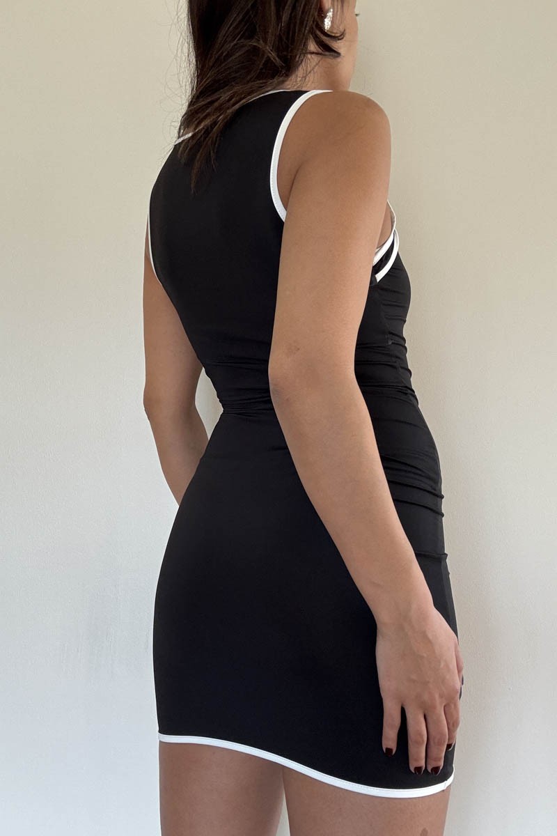 The stunning Shelby Dress is the perfect addition to your wardrobe. Its black fitted silhouette and white contrast lining create a stylish and eye-catching look. The square neckline adds a touch of elegance to this mini dress. Elevate your fashion game with the Shelby Dress.