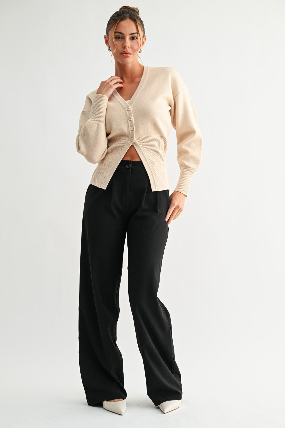 The Sloane is your wear-everywhere knit cardigan designed with a flattering V-neckline, soft ribbed texture, and a cinched waist that subtly defines your shape without feeling tight. The button-front design lets you wear it open, closed, or styled as a chic knit top.