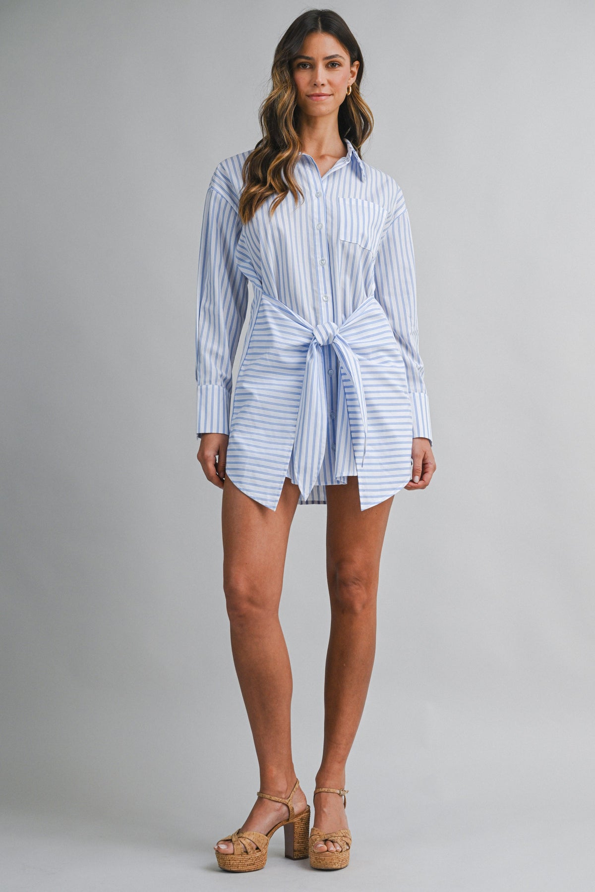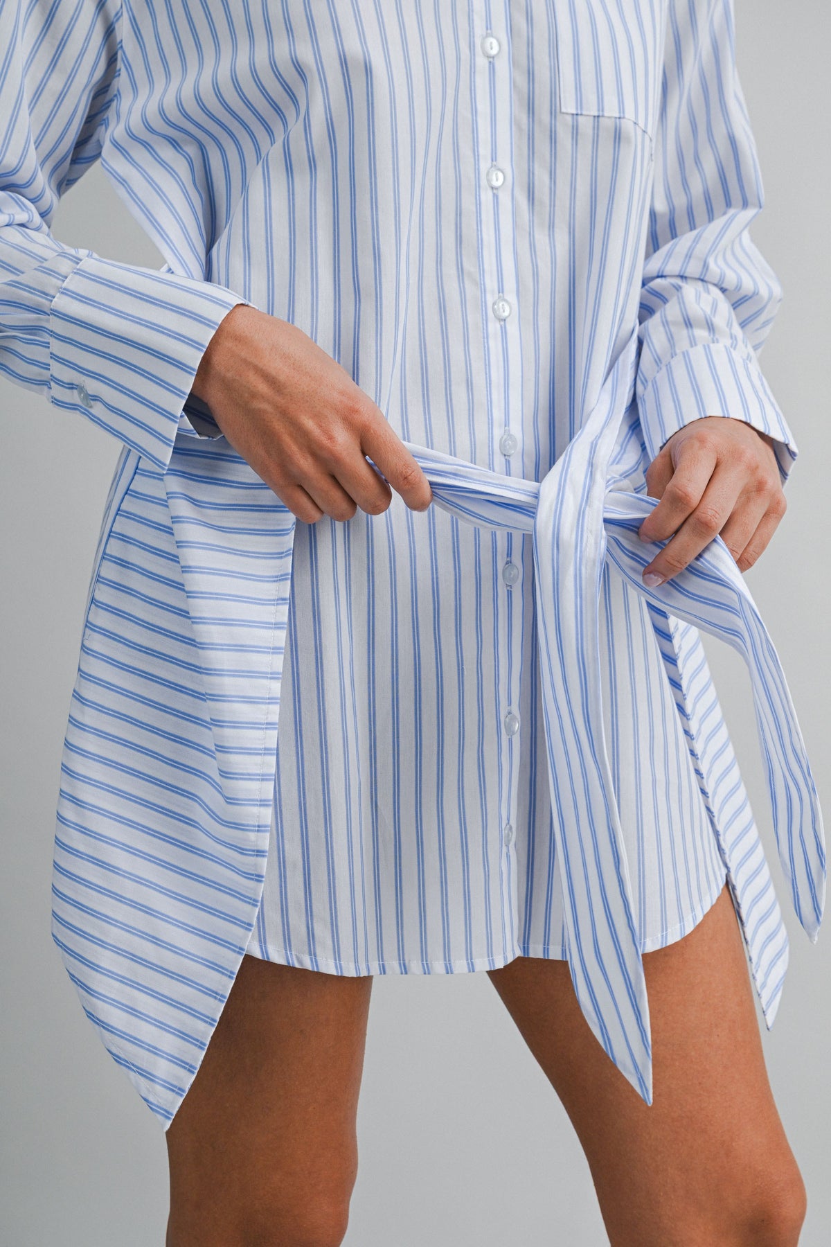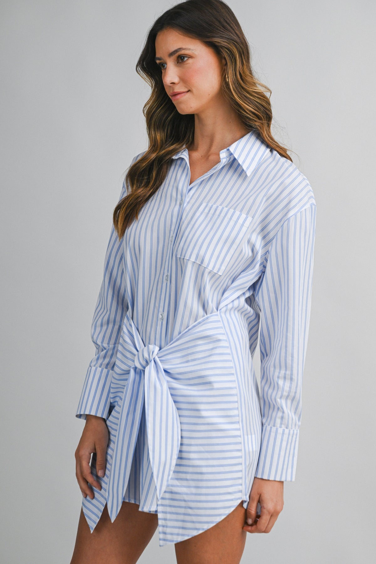 Designed in a breathable cotton blend with timeless vertical striping, this mini shirt dress features a pointed collar, full button-front closure, and long sleeves with tailored cuffs. The wrap-style skirt detail cinches at the waist with a self-tie belt, creating shape while keeping the look relaxed and wearable.