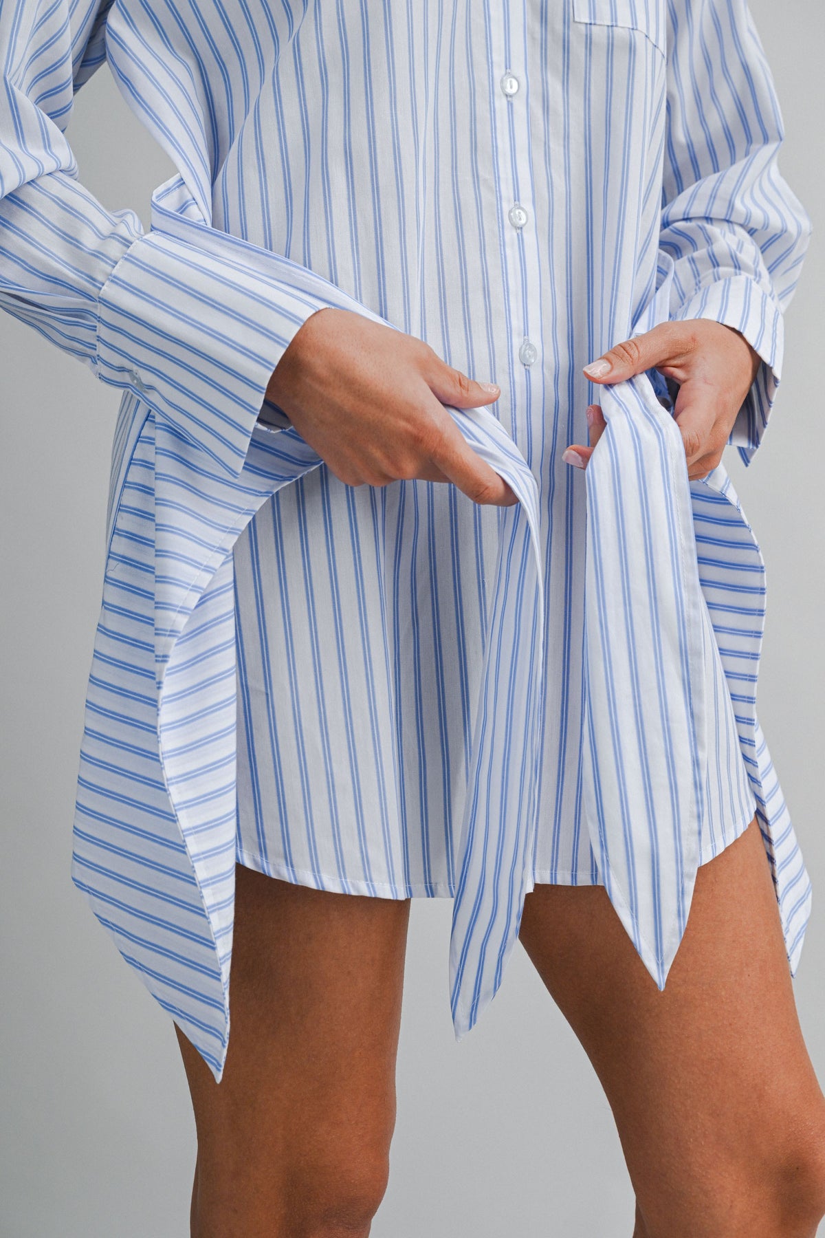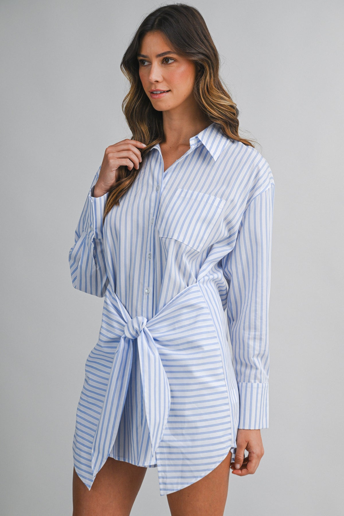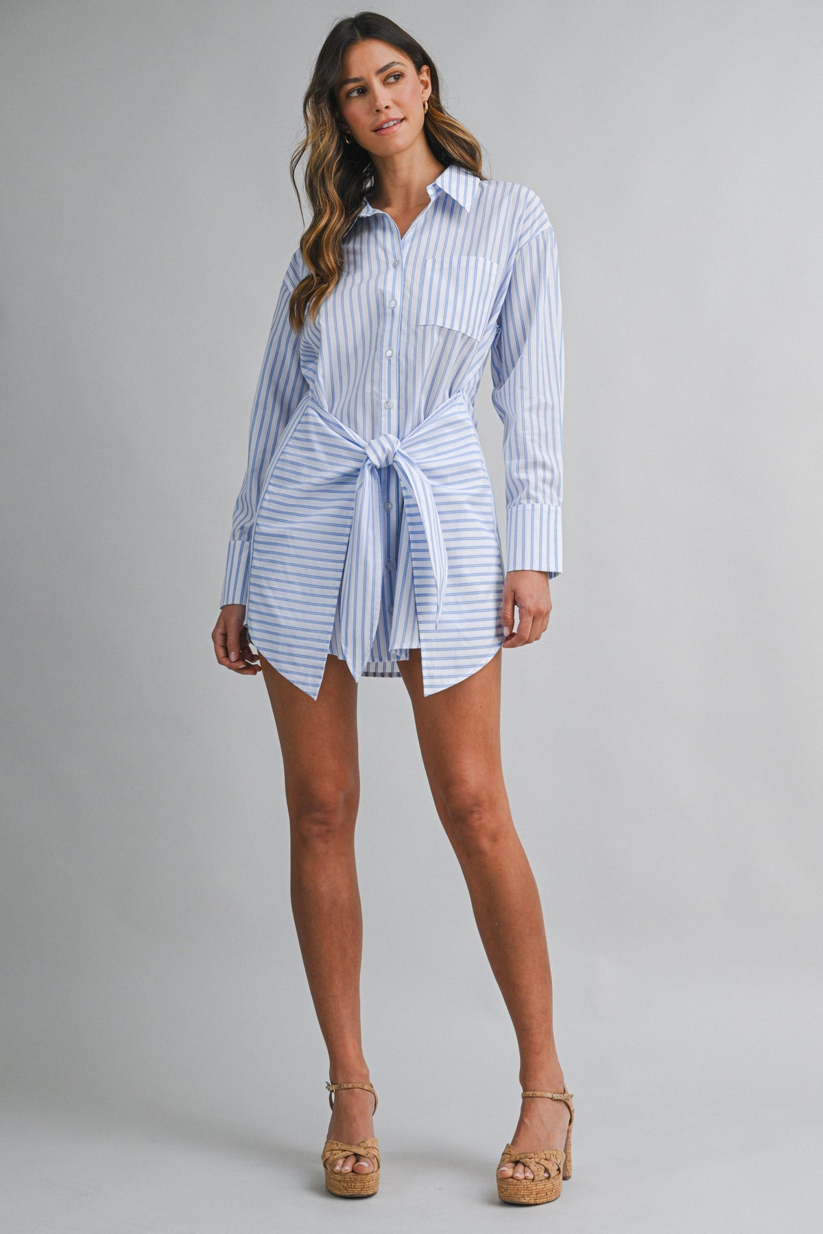 Designed in a breathable cotton blend with timeless vertical striping, this mini shirt dress features a pointed collar, full button-front closure, and long sleeves with tailored cuffs. The wrap-style skirt detail cinches at the waist with a self-tie belt, creating shape while keeping the look relaxed and wearable.